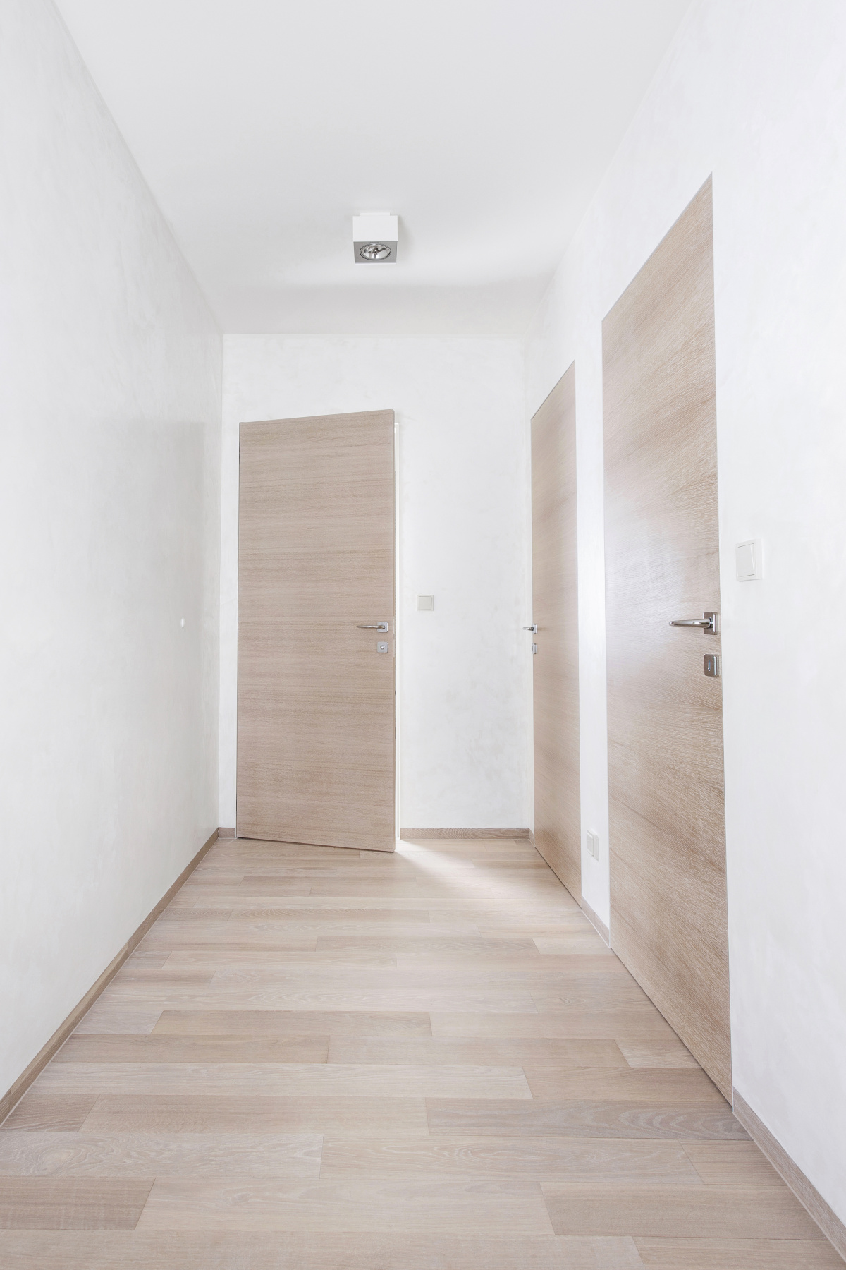 XINNIX systém skrytých zárubní ponúka nové varianty individuálnych riešení realizácie štýlových interiérov. Vďaka tomuto systému, konkrétne XINNIX X2 40, dvere vytvárajú hladkú plochu s okolitou stenou a v stene tak vyniká európsky bielený dub s vodorovnou dýhou, z ktorého boli dvere vyrobené.