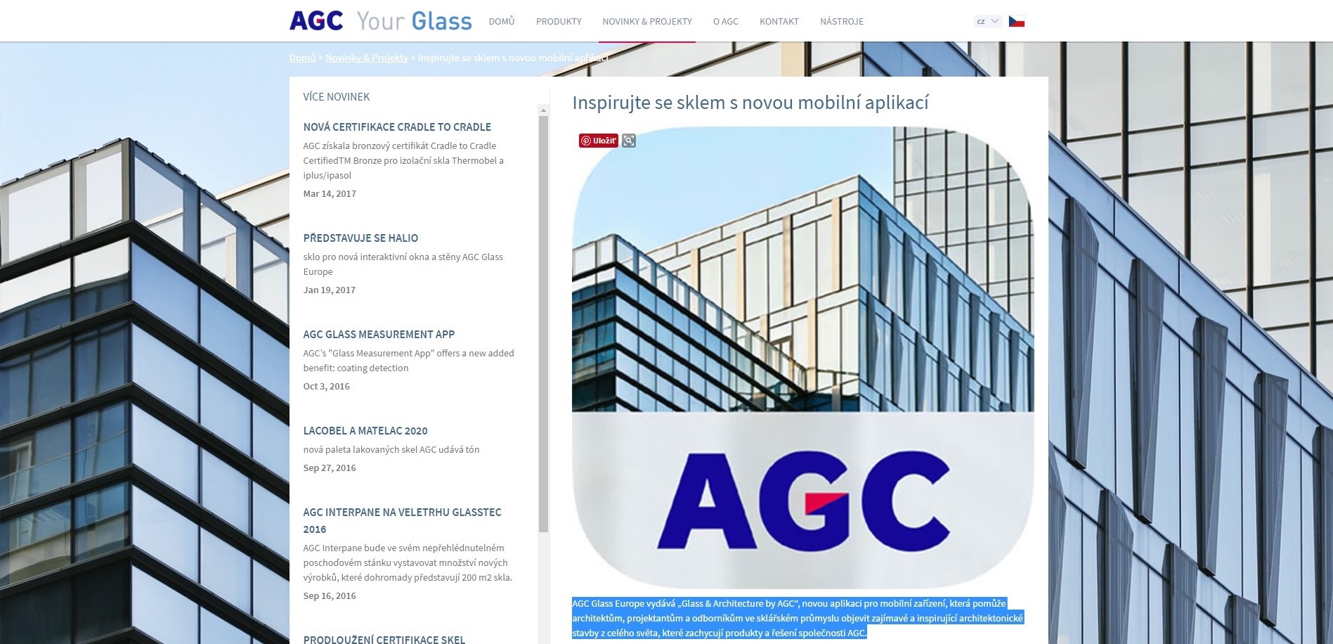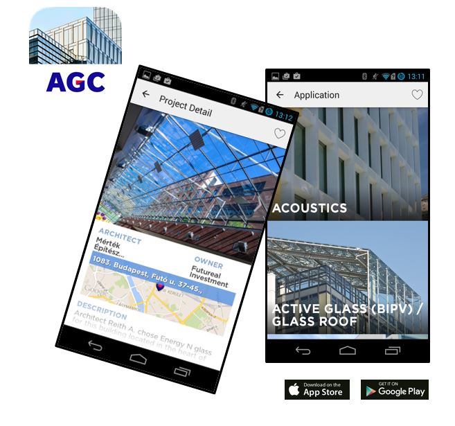 Aplikácia pre mobilné zariadenia pomáha architektom, projektantom a odborníkom v sklárskom priemysle objaviť zaujímavé a inšpirujúce architektonické stavby z celého sveta, ktoré prezentujú produkty a riešenia spoločnosti AGC. Jednoduché použitie a kompatibilita s Apple iOS a Android zariadeniami umožňuje mať projekty stále na dosah a použiť ich ako inšpiráciu pre svoje projekty. Používatelia si môžu vyhľadávať a prezerať sklenené aplikácie pre exteriér aj interiér podľa krajiny aj za pomoci ďalších kritérií na filtrovanie požadovaného výberu. Zatiaľ čo niektorí dajú prednosť rôznym typom aplikácií ako je aktívne sklo, štrukturálne zasklenia, obklady stien a i., ostatní ocenia možnosť vyhľadávať realizácie podľa typu stavby - napríklad: školy, kancelárske budovy, nákupné centrá atď.