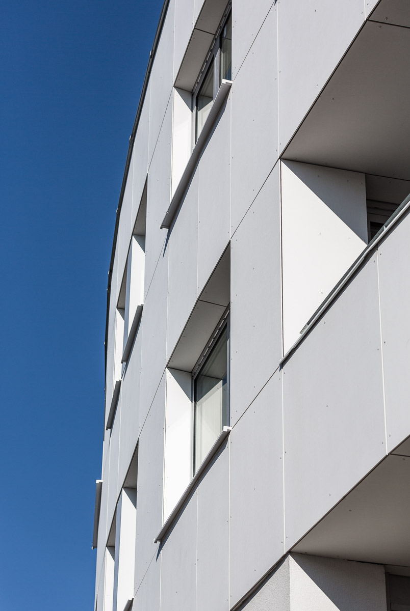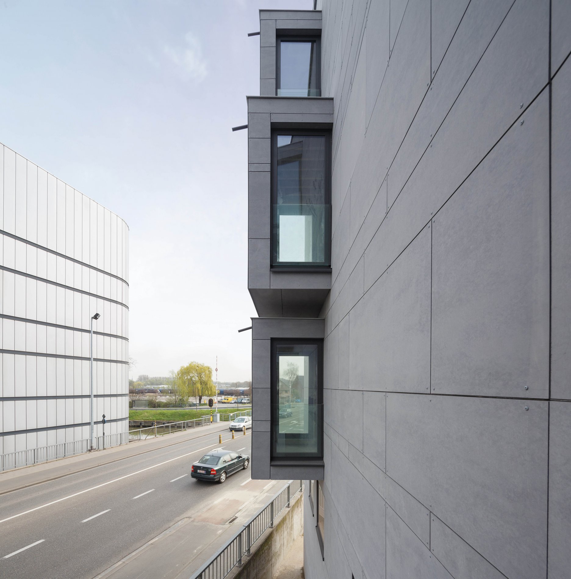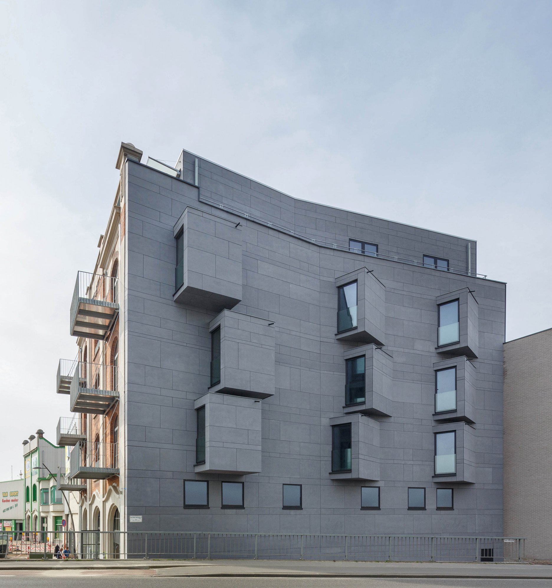 Bytový dom v belgickom meste Aalst je ukážkovým príkladom konverzie nevyužívanej industriálnej budovy na komfortné mestské bývanie. Architekt Willy Peynsaert zo štúdia Peynsaert Architecten citlivo skombinoval pôvodnú murovanú konštrukciu skladu so svetlosivým fasádnym obkladom EQUITONE [tectiva]. Svetelné podmienky v bytoch pomohli zlepšiť novovytvorené arkiere na severnej strane. Celkové usporiadanie fasády má rozhodne ďaleko od monotónnosti, a to aj vďaka rôznym formátom dosiek a oživeniu v podobe mierne zaoblených okien. Fasádne panely boli okrem severnej fasády použité aj na novej streche.