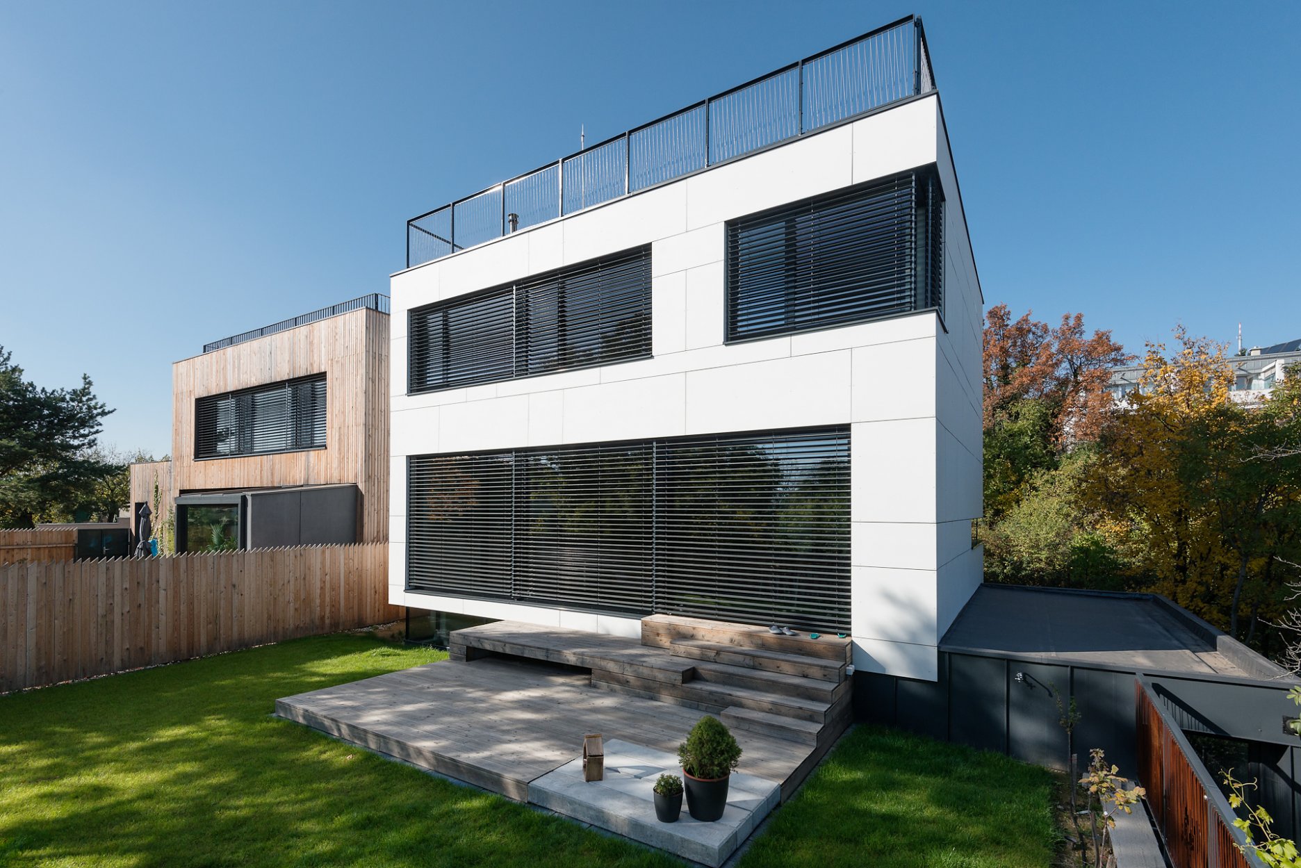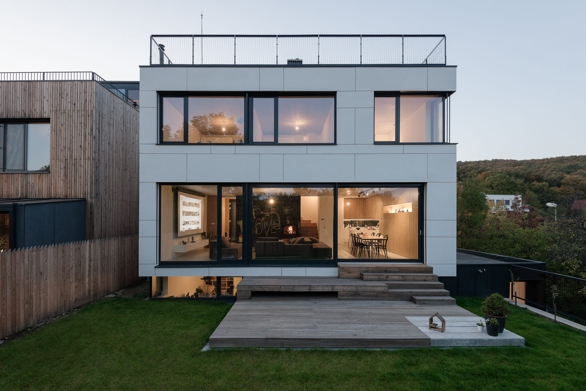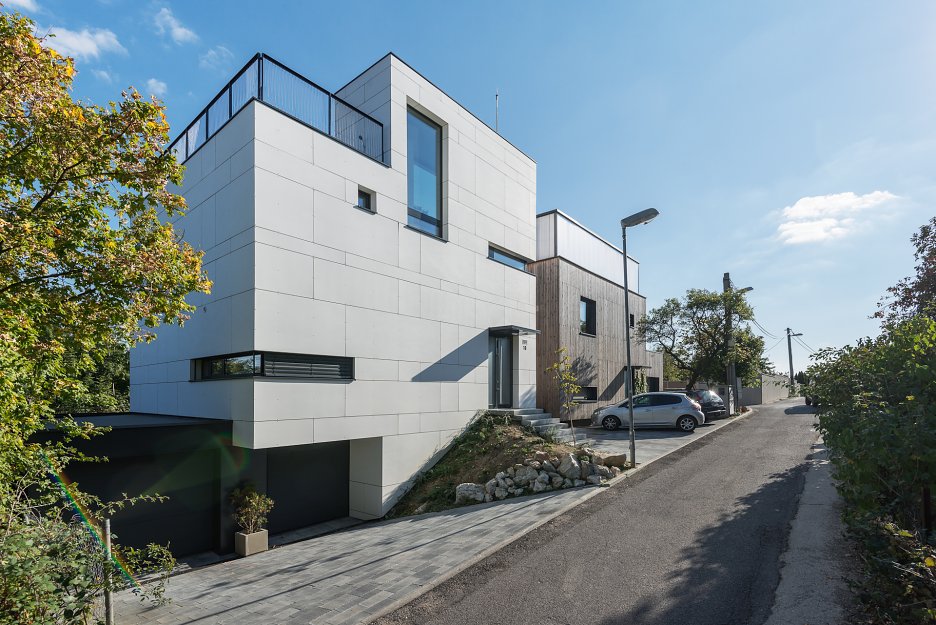 Rodinný dom na Brusnicovej ulici v Bratislave je trojpodlažný objekt situovaný v blízkosti lesa. Vyrástol koordinovane s vedľajším domom na spoločnom pozemku. Za architektonickým návrhom dvoch podobných domov s dvoma rôznymi prístupmi stoja architekti zo štúdia Compass. Obe stavby majú takmer totožný základný pôdorys a dispozičnú logiku, no predsa sú úplne iné. Ich finálnu podobu formovali individuálne priority majiteľov. Na prvý pohľad odlišné uličné fasády zjednocuje podobne rozohraná geometria okien rôznych veľkostí. Najpríznačnejším znakom, ktorý odlišuje dom A od svojho suseda, je jemne štruktúrovaný biely obklad z vláknocementových fasádnych dosiek EQUITONE [tectiva]. Ten kontrastuje s okolím a dodáva stavbe strohý vzhľad. Korešponduje tak s minimalistickým konceptom domu.