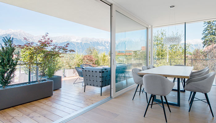 Trendové, štíhle sklené spoje umožňujú nenápadný prechod medzi veľkými sklenými plochami.