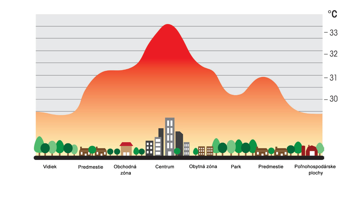 Mestská zástavba vykazuje znateľne vyššie teploty ako nezastavané okolité prostredie. Budovy, betónové a asfaltové povrchy ulíc, absorbujú cez deň obrovské množstvo tepla zo slnka. Teplota v centre miest je vďaka tomuto efektu o 1-3 ° C vyššia oproti lesnej krajine (vo večerných hodinách to môže byť až o 10 ° C). Mestské tepelné ostrovy majú nielen negatívny vplyv na ľudí, ktorí v nich žijú, zvyšujú aj náklady na chladenie budov a takto výrazné zvýšenie teploty následne ovplyvňuje aj množstvo zrážok v meste a jeho okolí. Prehrievanie vedie navyše k stúpaniu teplého vzduchu, ktorý so sebou zo zeme dvíha prach a ďalšie nečistoty, ktoré potom následne dýchame. Poletujúci prach je príčinou až 15% poklesu slnečného svitu. Vyššia teplota vzduchu spolu so znečisťujúcimi látkami tiež urýchľuje tvorbu smogu.