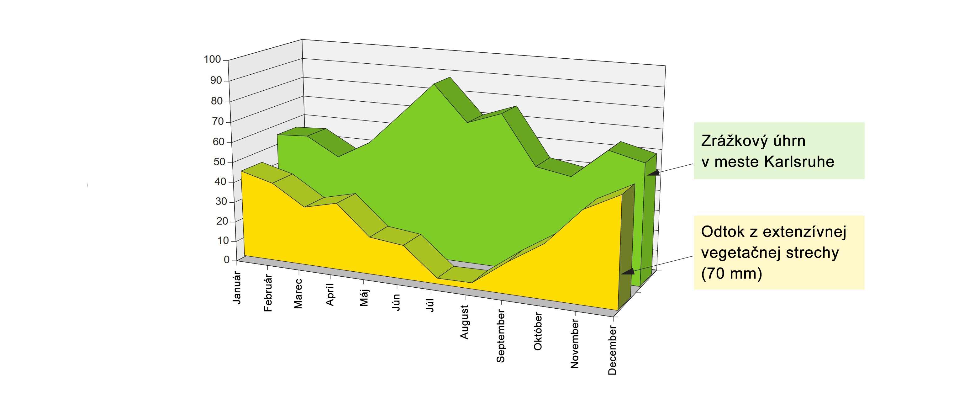 Odtok dažďovej vody z bežnej betónovej strechy s hydroizoláciou sa pohybuje medzi 95-100%. Zelená strecha dokáže toto množstvo redukovať priemerne na 50%, ale existujú aj typy zelených striech, ktoré odtok redukujú na iba 5%. Pre tieto retenčné strechy je možné použiť aj hydroakumulačné dosky ISOVER.