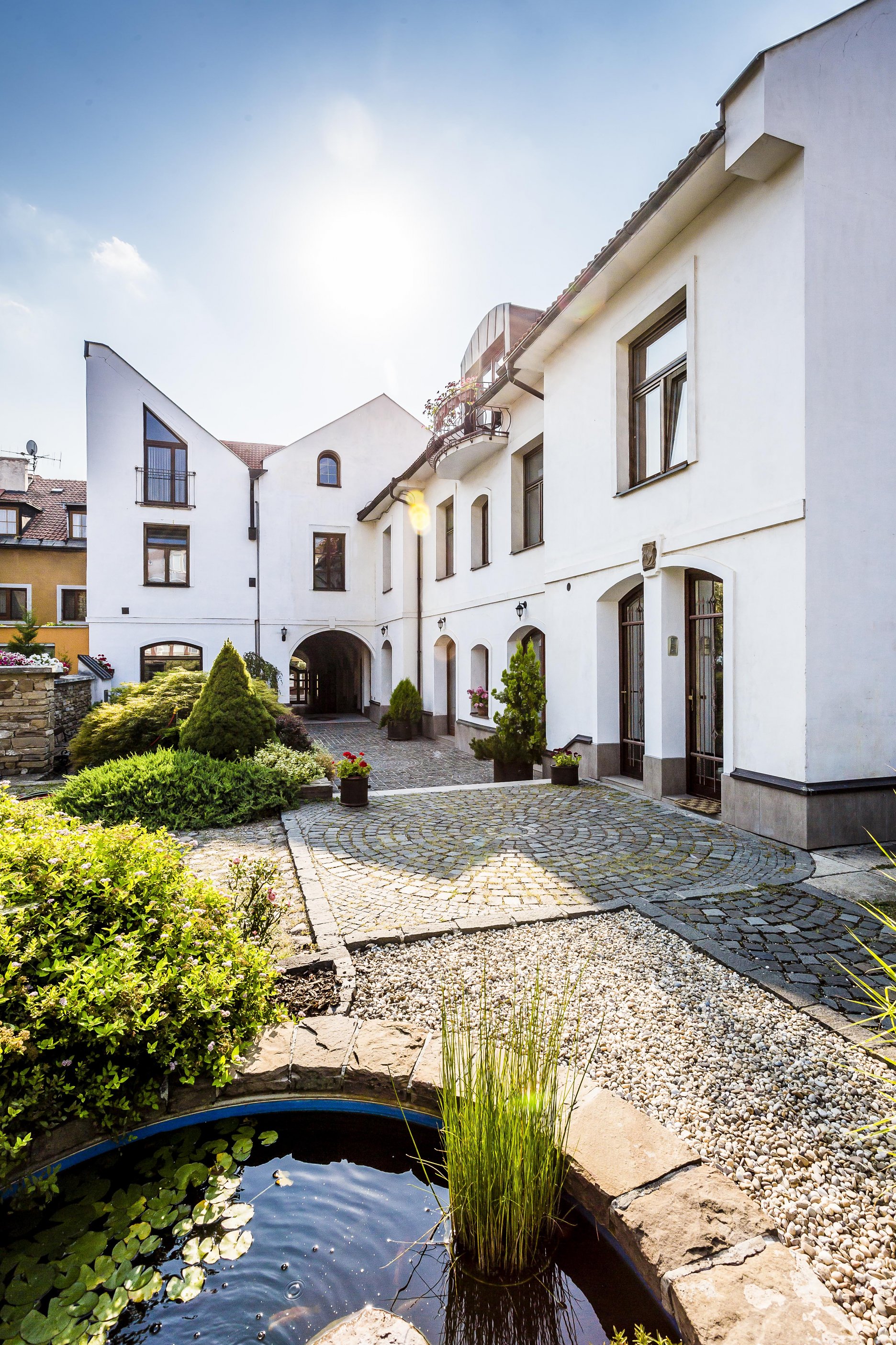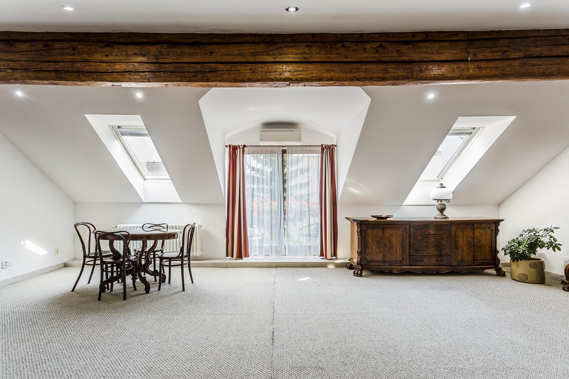 V zadnej časti historického objektu, ktorá je situovaná vo dvore, sa nachádza samostatný vchod do presvetleného podkrovného bytu. Ten sa nachádza na druhom podlaží a poskytuje komfortné ubytovanie na prenájom. Minimalistický, strohý interiér ozvláštňuje eklektický historický nábytok. Koncepcia tohto priestoru si vyžiadala osadenie bezúdržbových strešných okien VELUX. Okná jednak pôsobia v presvetlenom interiéri harmonicky a zároveň majiteľom uľahčujú údržbu.