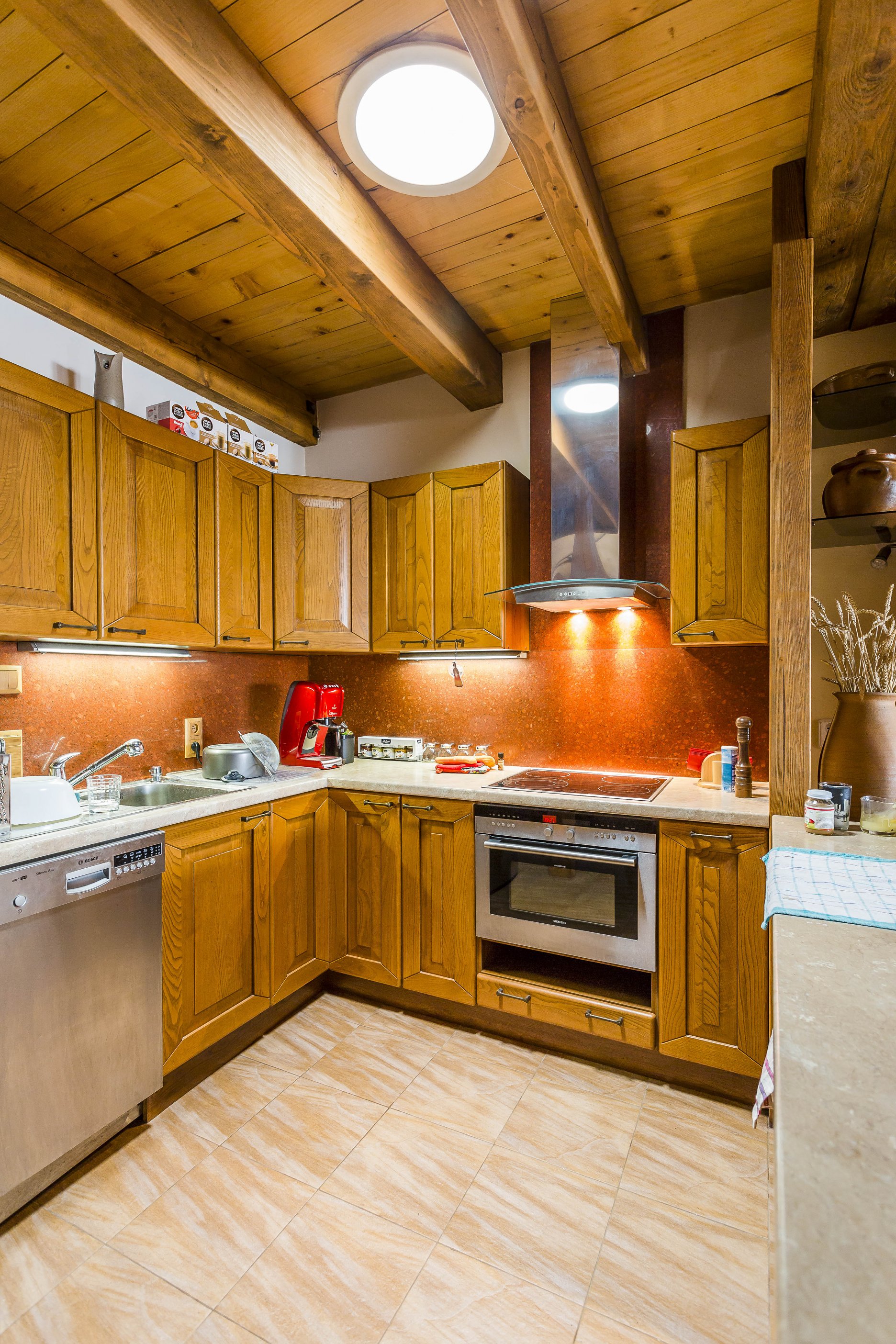 Zachovať pôvodný tvar strechy a zároveň vdýchnuť podkroviu nový život bolo výzvou aj pre skúseného architekta. „Napriek komplikáciám sa podarilo vymyslieť systém kombinácie pôvodných a nových strešných trámov, ktorý zabezpečil stabilitu konštrukcie. Celý krov v podstate stojí na stĺpe, ktorý sa nachádza uprostred rokovacej miestnosti,“ vysvetľuje architekt.