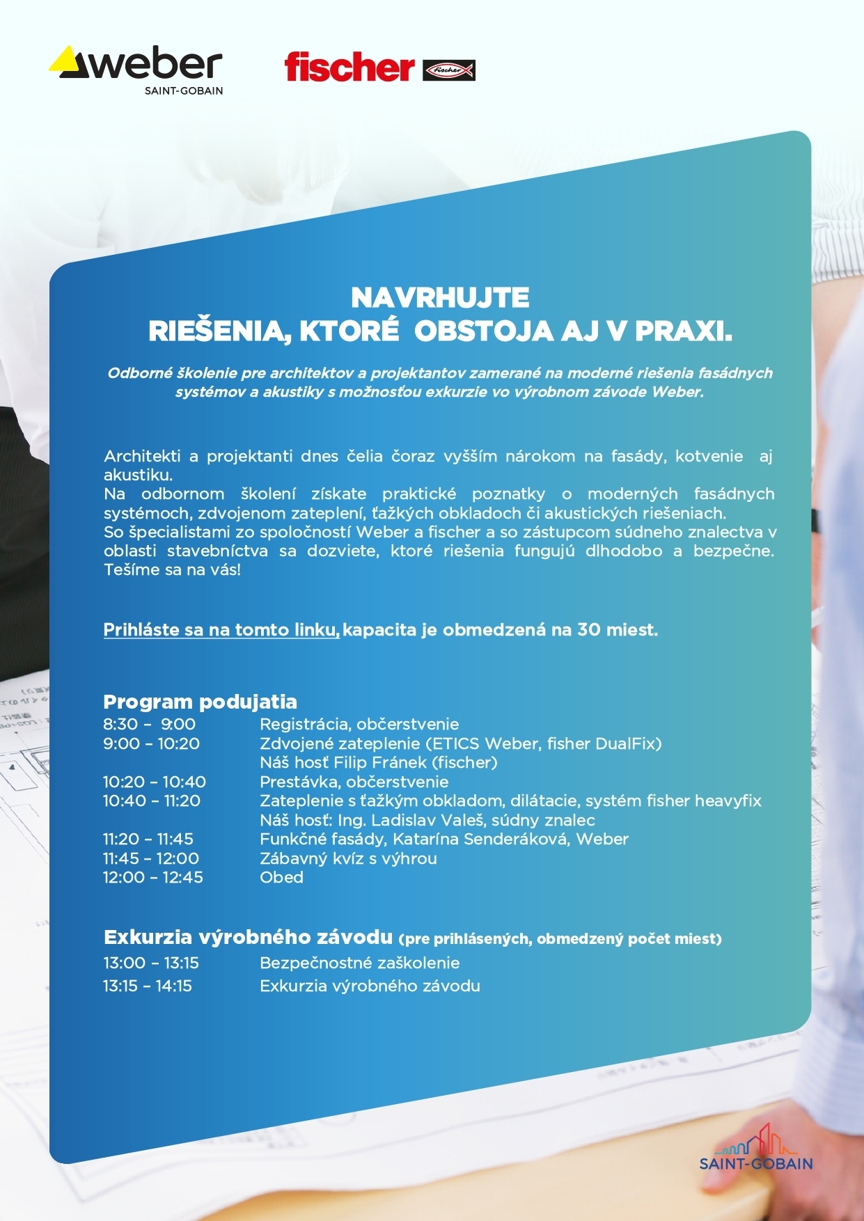Architekti a projektanti dnes čelia čoraz vyšším nárokom na fasády, kotvenie aj akustiku. Na odbornom školení získate praktické poznatky o moderných fasádnych systémoch, zdvojenom zateplení, ťažkých obkladoch či akustických riešeniach. So špecialistami zo spoločností Weber a fischer a so zástupcom súdneho znalectva v oblasti stavebníctva sa dozviete, ktoré riešenia fungujú dlhodobo a bezpečne.
