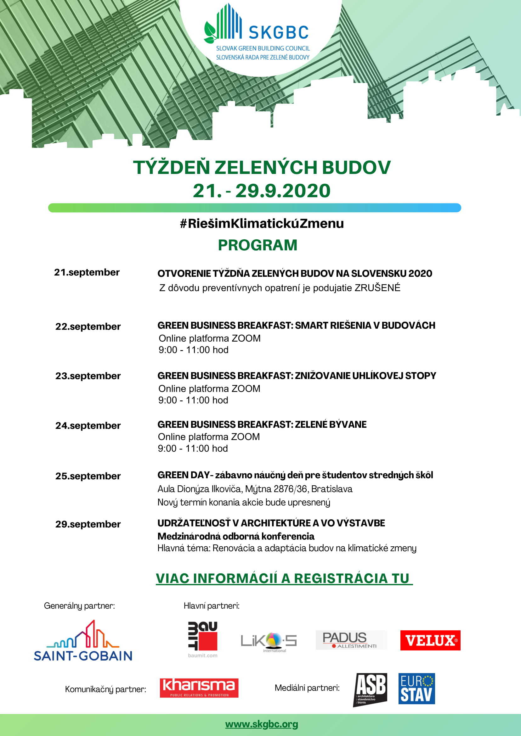 Už desiaty raz sa na Slovensku v predposledný septembrový týždeň v rámci celosvetovej kampane World Green Building Week budú konať odborné podujatia zamerané na propagáciu trvalej udržateľnosti, ochranu životného prostredia, ekologického spôsobu života a zdravého bývania. Obdobné akcie budú paralelne prebiehať aj v iných krajinách, na Slovensku podujatia zastrešuje Slovenská rada pre zelené budovy (SKGBC). Generálnym partnerom aktuálneho ročníka je svetový líder na trhu stavebných materiálov skupina Saint-Gobain.