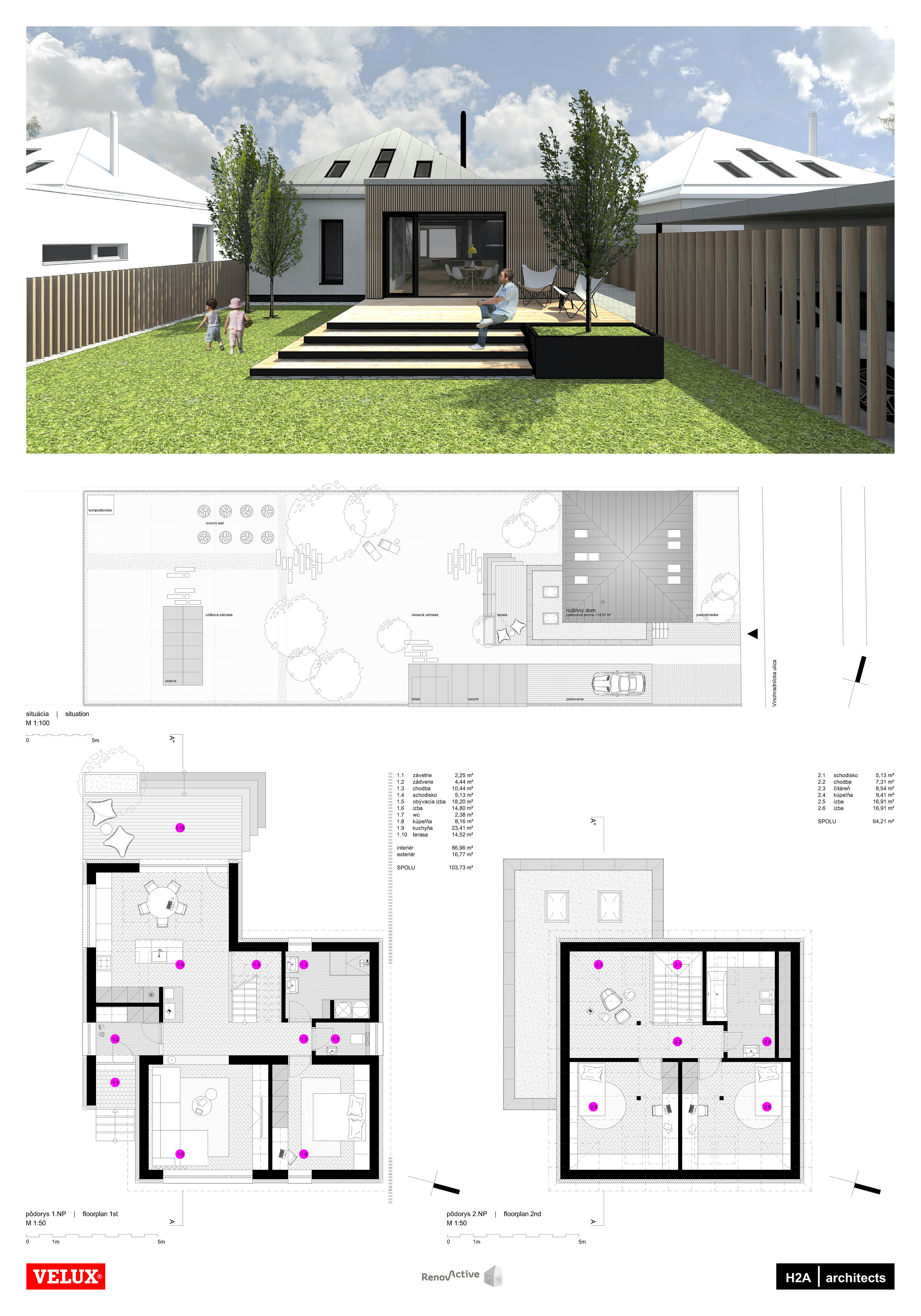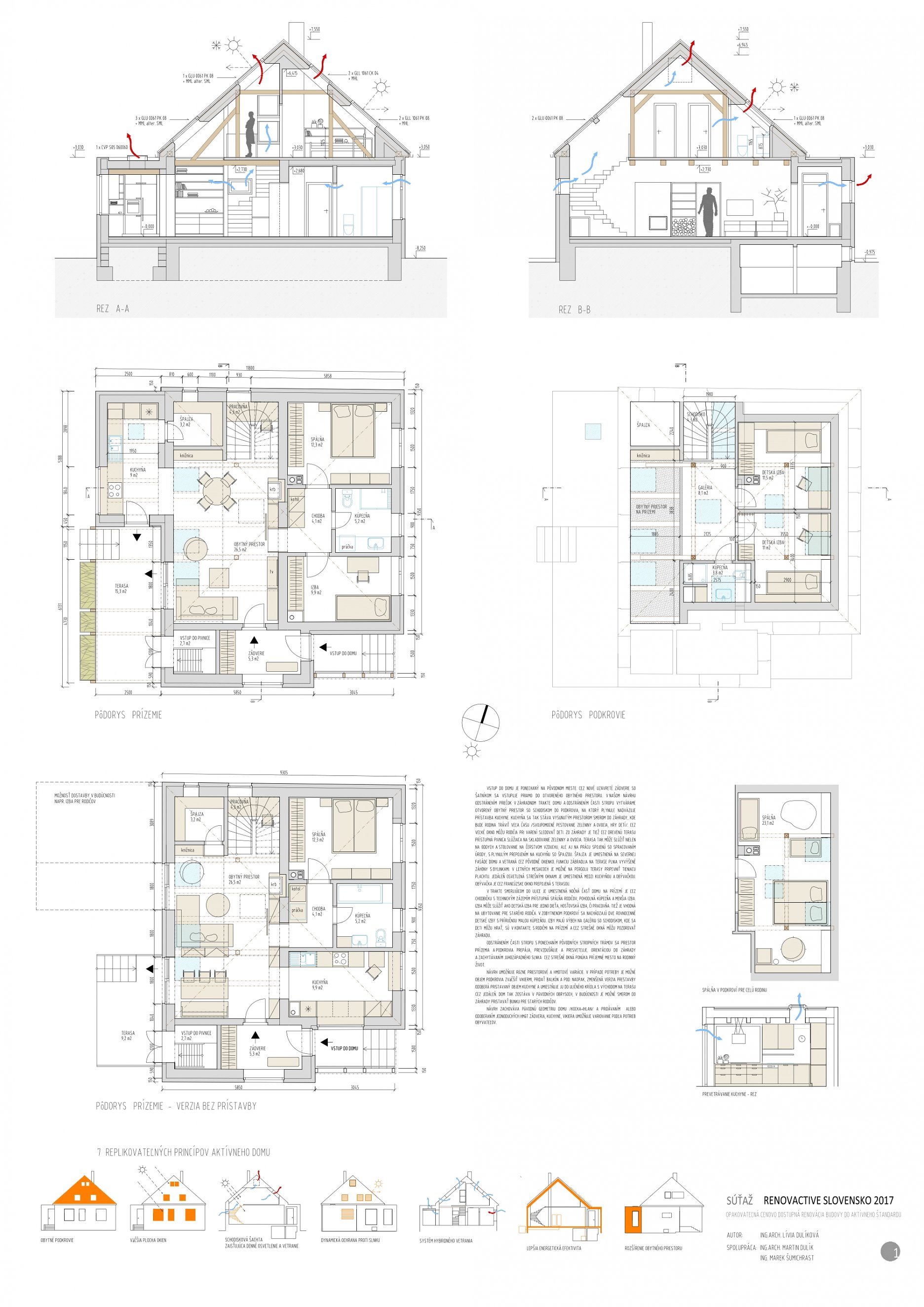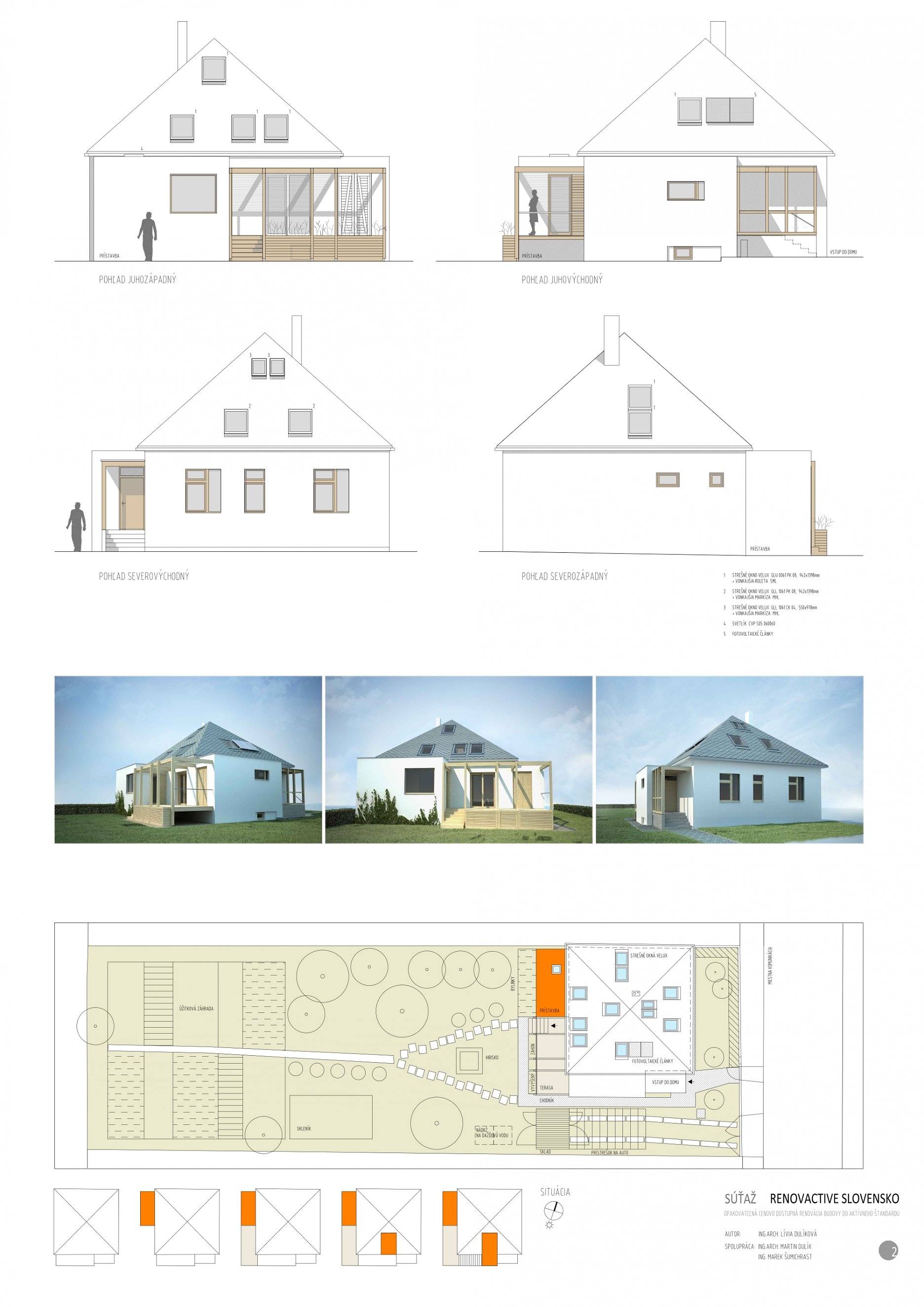 Stavebná časť projektu odštartovala dvojkolovou architektonickou výzvou. Slovenskí architekti sa do nej mohli zapojiť so svojimi návrhmi na opakovateľnú cenovo dostupnú renováciu typického rodinného domu do aktívneho štandardu.