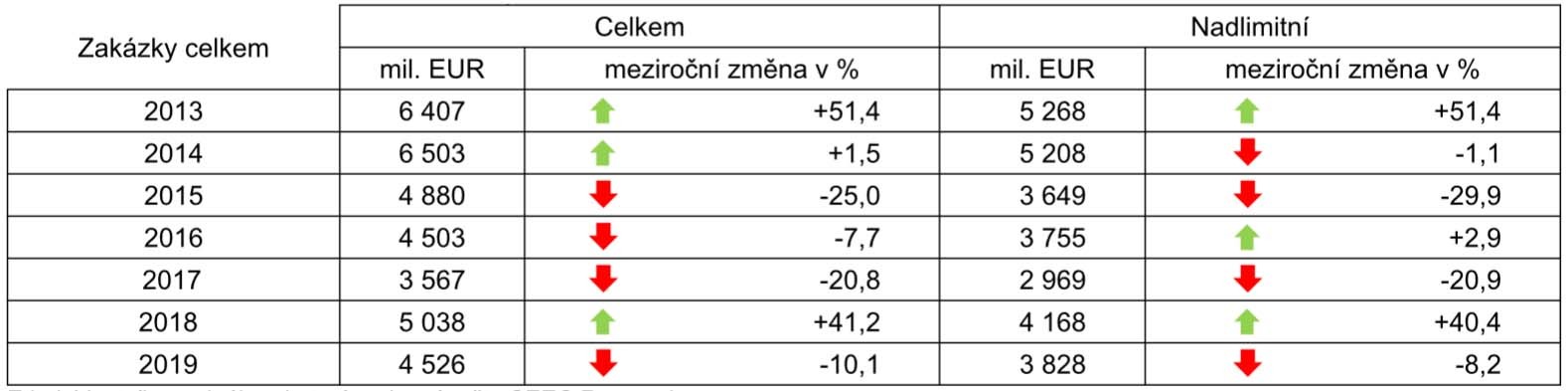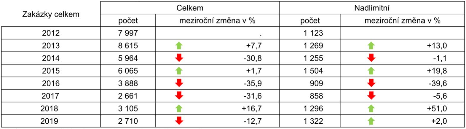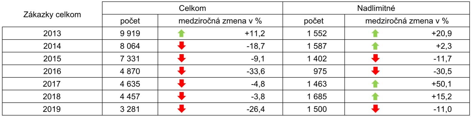 V roku 2019 bolo zatiaľ zadaných 2 710 zákaziek, čo je o 12,7% menej než v roku 2018. Pokiaľ by sme porovnali iba nadlimitné zákazky, dostaneme medziročný rast počtu zadaných zákaziek o 2,0%. Niektoré zadávacie konania stále bežia a tiež ne všetky oznámenia o zadaní zákazky boli dodané, preto treba očakávať, že v ďalších mesiacoch budú dáta ešte aktualizované. Hodnota zákaziek zadaných v roku 2019 činila 4 526 mil. € a medziročne klesla o 10,0%. Pokiaľ by sme posudzovali hodnotu zadaných zákaziek iba pre nadlimitné zákazky, dostaneme medziročný pokles o 8,2%. Dáta budú ďalej aktualizované.