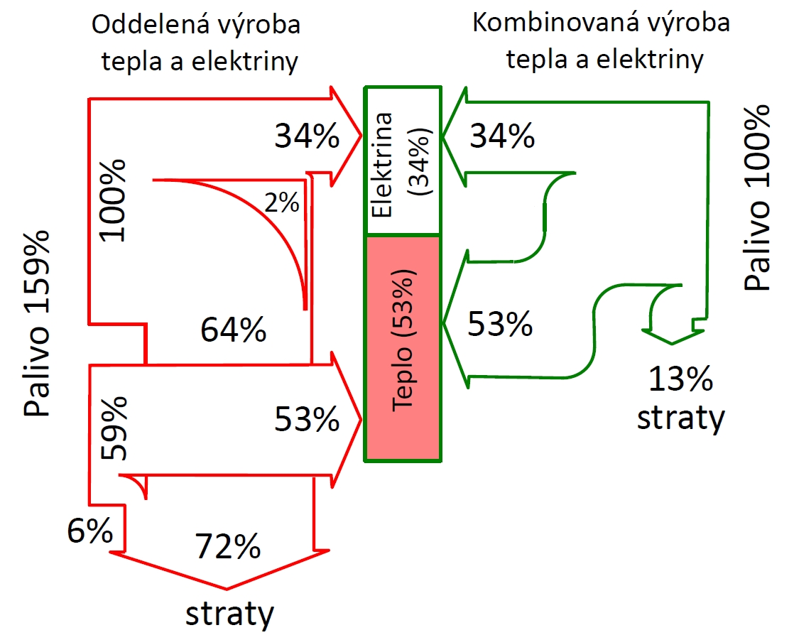 Hlavný dôvod pre použitie kogeneračných jednotiek (ďalej len „KGJ“), t.j. zariadení pre kombinovanú výrobu tepla a elektrickej energie, je vyššia účinnosť premeny energie (v palive) na inú formu energie, v tomto prípade na tepelnú a elektrickú. Ak je projekt dobre navrhnutý a realizovaný, dochádza pri kombinovanom spôsobe výroby energií k šetreniu primárnej energie (obrázok č. 1), v porovnaní s oddelenou výrobou tepla a elektriny, až o 40%.