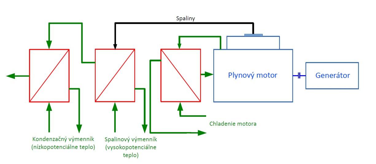 Celý systém výroby elektrickej energie v plynových motoroch je založený na princípe premeny tepelnej energie na mechanickú prácu a následne prostredníctvom generátora na elektrickú energiu. Palivo je privedené do spaľovacieho motora, kde dôjde k jeho premene na tepelnú energiu a jej časť, približne (30 až 40)%, sa mení na mechanickú energiu. Generátor (synchrónny, alebo asynchrónny) vygeneruje tak elektrickú energiu, ktorá sa ďalej využije priamo v mieste výroby, alebo sa predá do rozvodnej elektrickej siete. Zvyšná využiteľná časť tepelnej energie (50 až 60%) sa za pomoci sústavy výmenníkov využije na ohrev vody, resp. iného technologicky vhodného média. Tepelný výkon kogeneračnej jednotky je potom súčet tepelných výkonov jednotlivých okruhov (výmenníkov tepla) – výmenník chladenia motora (primárny okruh), spalinový výmenník a kondenzačný nízkoteplotný výmenník tepla (sekundárny okruh) (obrázok č. 2)