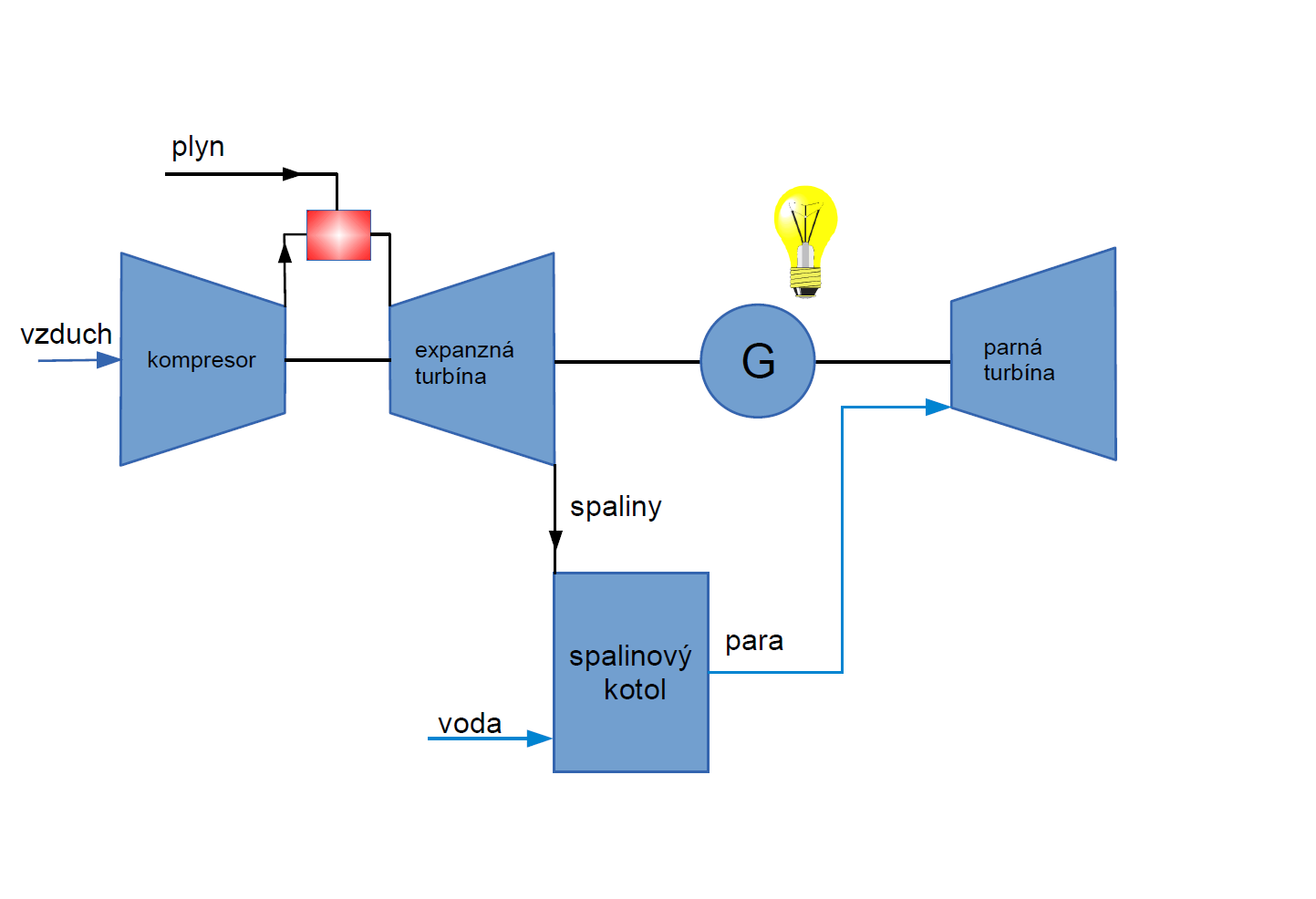 V paroplynových cykloch (ďalej len „PPC“) je princíp totožný ako v KGJ. Palivo sa privedie do spaľovacej turbíny, kde sa časť energie premení na mechanickú, ktorá sa využije na generovanie elektrickej energie. Spaliny o vysokej teplote sa privedú do spalinového parného kotla (môže byť s, alebo bez prikurovania), kde sa vyrobí vodná para o požadovaných parametroch, a tá sa následne využije v parnej protitlakej, alebo kondenzačnej turbíne. Mechanická energia z parnej turbíny sa opäť využije na generovanie elektrickej energie. Zvyšná para (teplo) sa využije na vykurovanie, resp. technologické účely (obrázok č. 3).