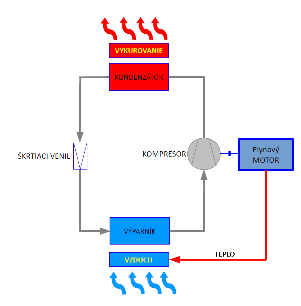 Tepelné čerpadlo (ďalej len „TČ“) je sústava zariadení, ktoré slúžia na odobratie tepla zo zdroja tepla (zem, voda, vzduch, odpadové teplo) pri nízkej teplote, a dodaním dodatočnej energie (zemný plyn) ho odovzdá pri vyššej teplote.