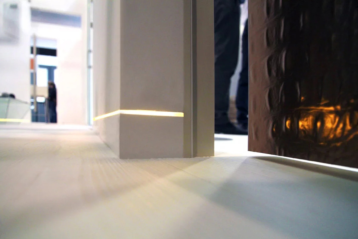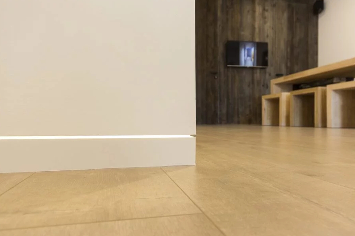 Na vrchole dizajnového rebríka je skrytá soklová lišta DORSIS LINUS s upravenou vkladkou s LED pásikom – nočné líniové podsvietenie v jednej rovine s podlahou vytvára skutočne jedinečný vizuálny dojem.
