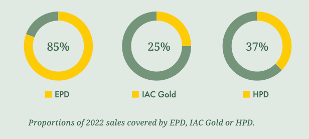Výhodou akustických panelov Ecophon z hľadiska udržateľnosti je ich výroba z recyklátov v rozsahu 42 až 60 percent. Okrem toho až 85 percent predaja tvoria výrobky s environmentálnym prehlásením EPD, vyše tretinu so zdravotným prehlásením (HPD) a štvrtinu s certifikátom Indoor Air Comfort Gold (IAC Gold).