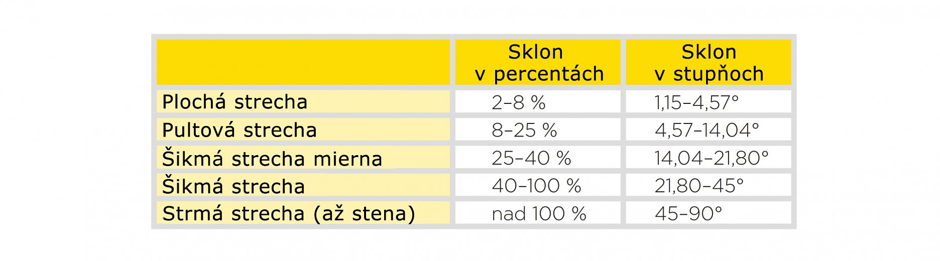 Príliš veľký sklon býval veľkým problémom realizácie vegetačnej strechy. S doskami z hydrofilnej minerálnej vlny je ale možné ozeleniť ako ploché strechy, tak úplne zvislé steny. Pre lepšiu orientáciu v projekčnej časti katalógu je uvažované toto rozdelenie striech podľa sklonu.