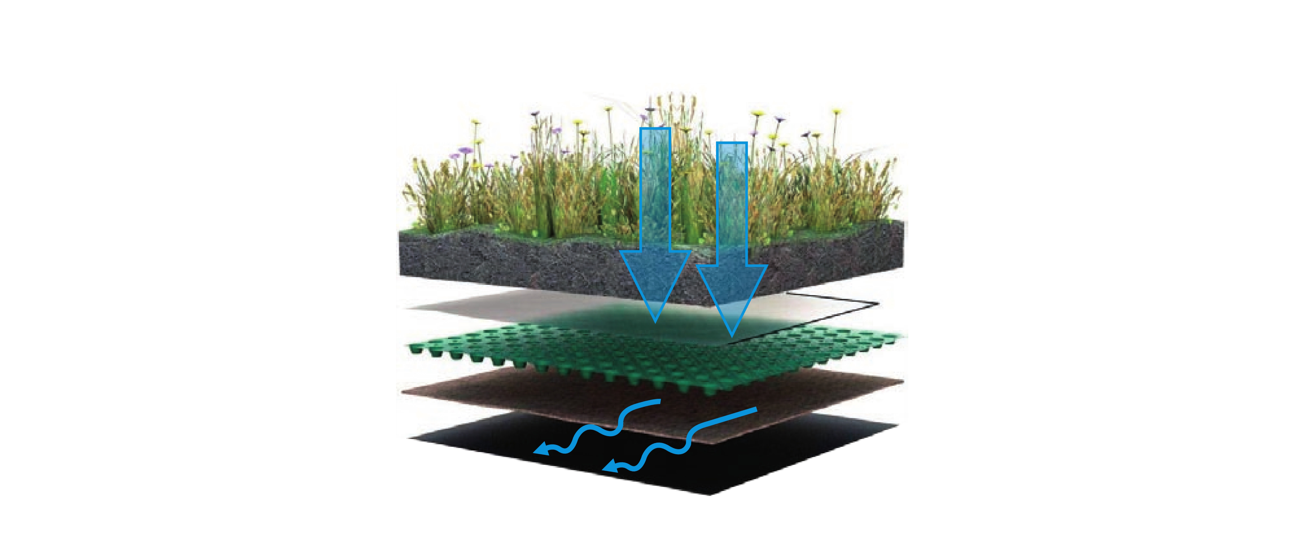 strechy. Pokiaľ bude mať použitý materiál zároveň veľkú vodopriepustnosť, voda bude veľmi rýchlo odtekať a bude sa hromadiť v spodnej časti strechy. Horná časť strechy pritom zostane suchá a rastliny v nej bez dodatočnej zálievky neporastú (Pozri nasledujúci obrázok).
