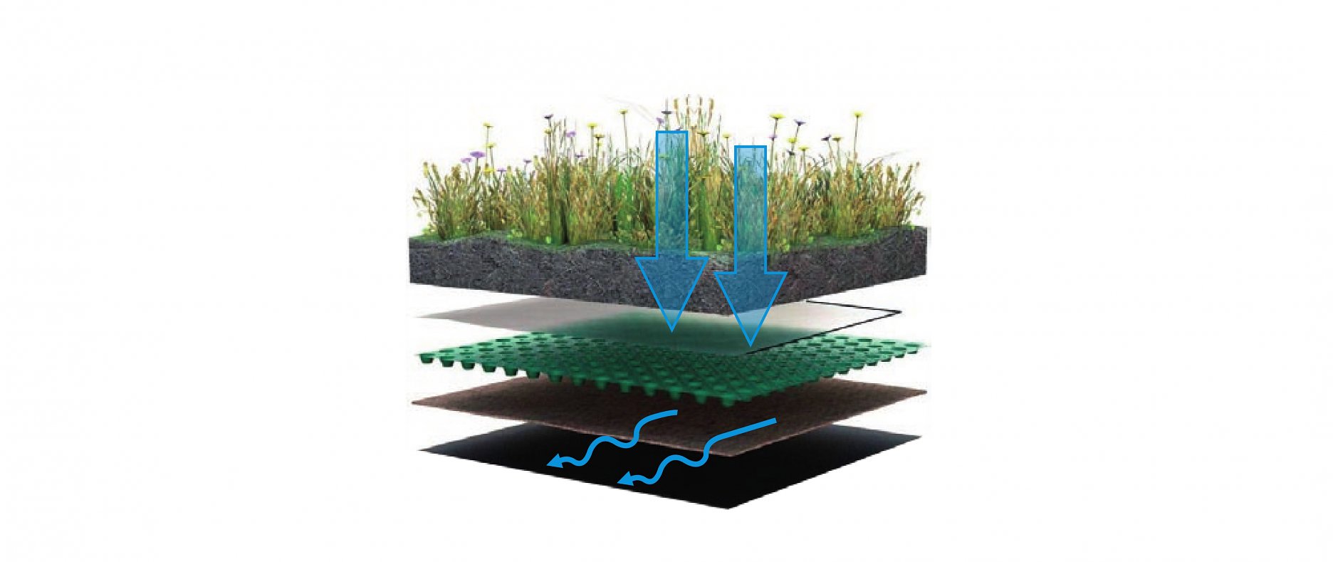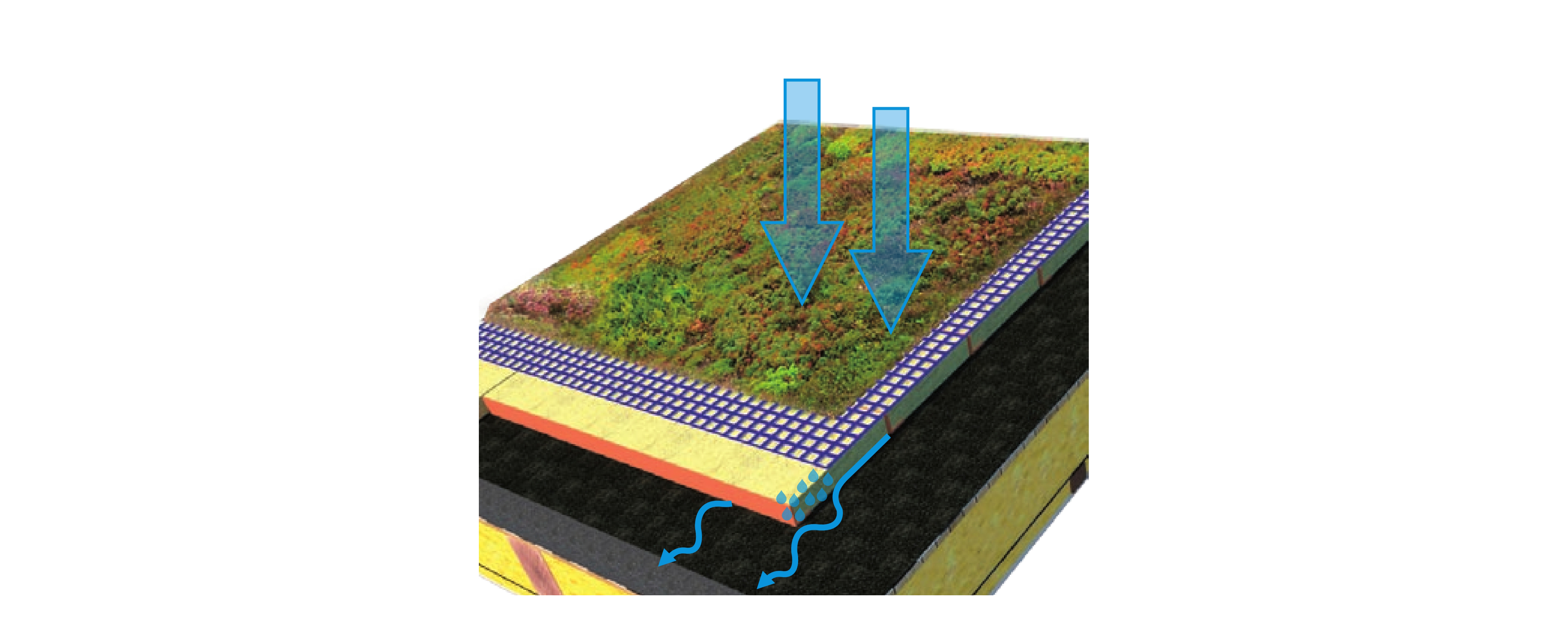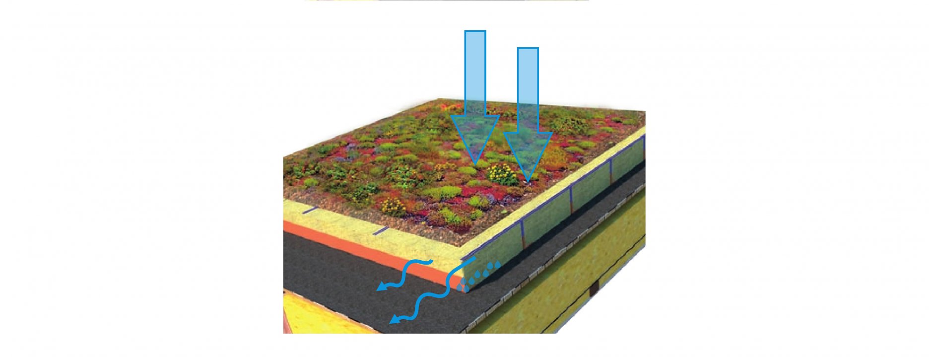 Ak je úplne naplnená hydroakumulačná kapacita strechy, prebytočnú vodu je nutné odvádzať spodnou časťou vegetačného súvrstvia preč. Strechy s hydrofilnou minerálnou vlnou majú aj v najúspornejšej variante (50 mm Isover FLORA + 30 mm substrát) veľmi dobrú vodnú kapacitu, minimálne 51 litrov na m2. Toto množstvo zodpovedá veľmi silnému dažďu v dĺžke trvania 2 hodiny (za ideálneho stavu, keď je strecha úplne vyschnutá). Dimenzovanie drenáže strechy sa ale vždy vykonáva za stavu maximálneho nasýtenia vodou.