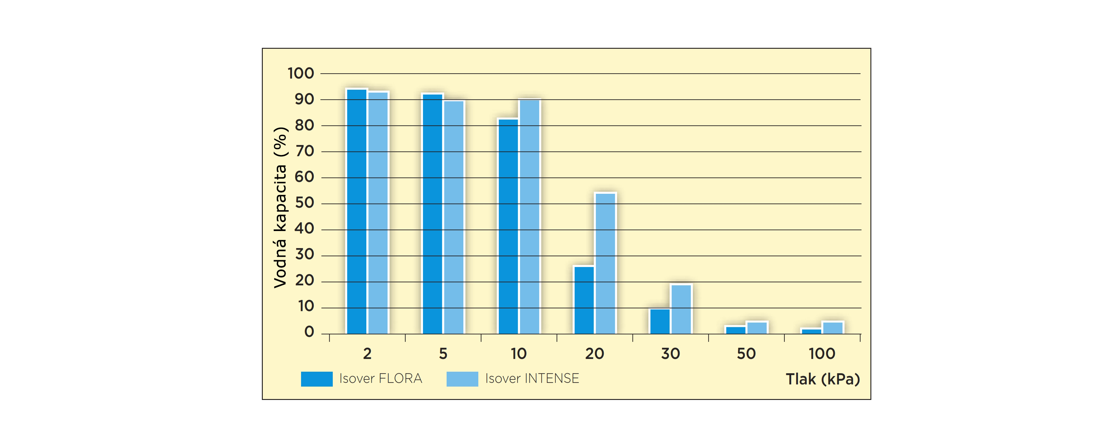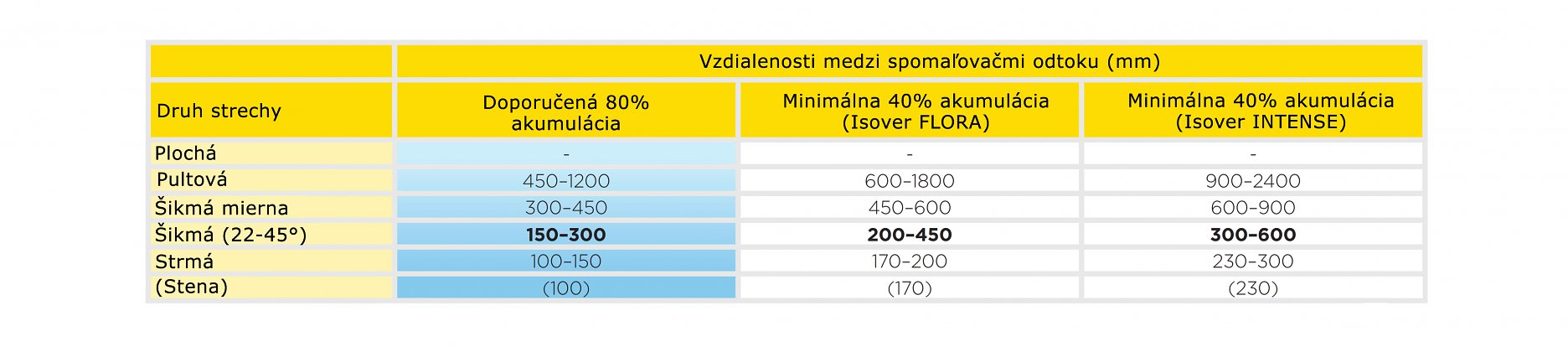 So vzrastajúcim tlakom vody vo vegetačnom súvrství klesá schopnosť materiálu túto vodu udržať, a tá je následne vytláčaná do drenážnej vrstvy. Minerálna vlna dokáže bez problémov vydržať tlak 10 kPa pri zachovaní vodnej kapacity okolo 80%. Tlak 10 kPa zodpovedá tlaku vodného stĺpca s výškou 10 cm. Pre maximalizáciu hydroakumulácie je teda nutné extenzívne šikmú vegetačné strechu navrhnúť so spomaľovačmi na túto hranicu. Ak v streche budú navrhnuté spomaľovače pod úroveň 40% akumulácie, alebo nebudú spomaľovače inštalované vôbec, je nutné použiť umelú závlahu. Minimálna hydroakumulácia zodpovedá výške vodného stĺpca 17 cm pri výrobku Isover FLORA a 23 cm pri výrobku Isover INTENSE. Pri použití iných výrobkov pre hydroakumuláciu (napr. akumulačný substrát) je nutné túto výšku prepočítať.