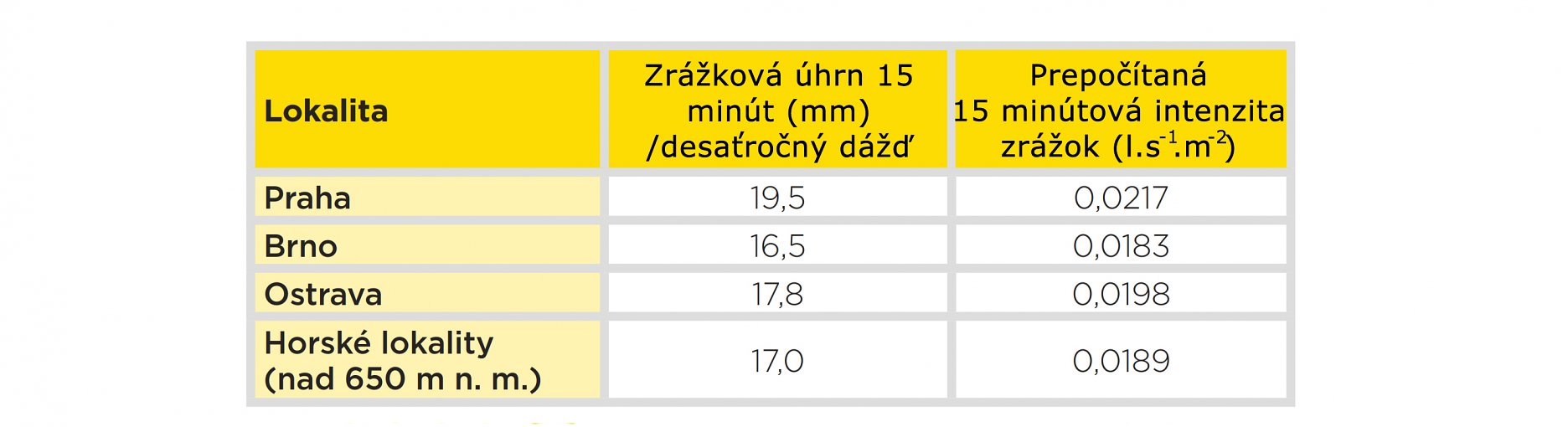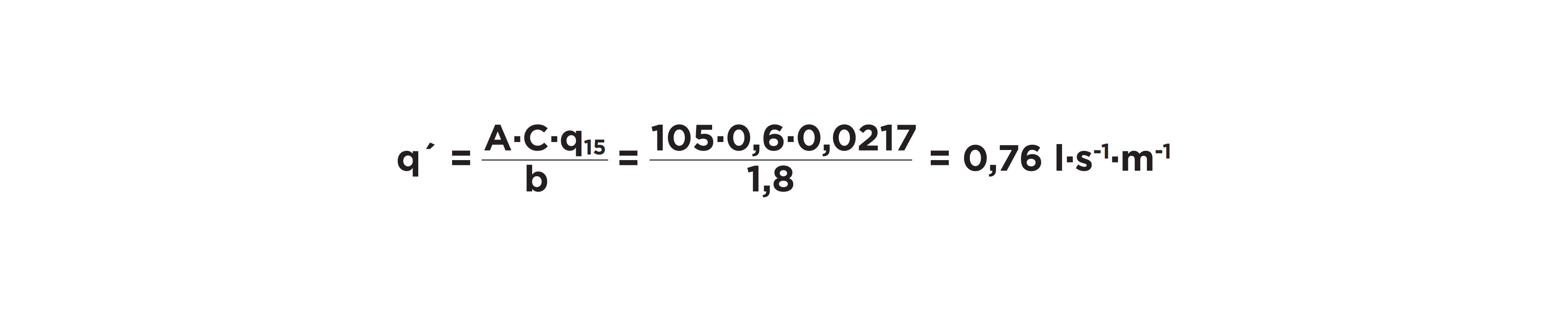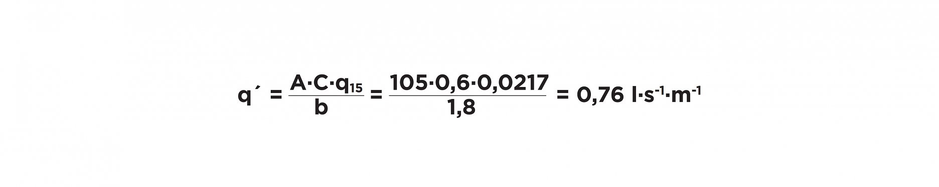Vpuste sú lemované štvorcovým oplechovaním s hranou 30 cm. Odvodňovaná plocha teda bude A = 7 x 15 = 105 m2, výpočtová odtoková šírka b = 2 x (0,3 + 0,3 + 0,3) = 1,8 m. Súčiniteľ odtoku C je prevzatý z katalógových skladieb (0, 6) a intenzita 15 minútového dažďa z tabuliek normy.