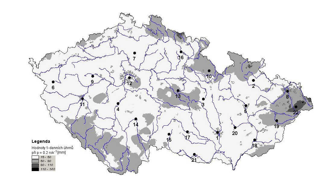 Regulované odvádzanie zrážkových vôd musia byť také, aby nedochádzalo k väčšiemu odtoku ako 10 litrov za sekundu z hektára plochy pozemku pri tridsaťminútovom daždi, ak nestanoví správcu toku inak. Pre vyčíslenie takéhoto dažďa je možné opäť siahnuť do normy ČSN 75 9010 (Vsakovacie zariadenia zrážkových vôd). Zrážkomerná stanice Praha-Hostivař uvádza intenzitu zrážok 23,2 mm na meter štvorcový (inými slovami 23,2 litrov na meter štvorcový).