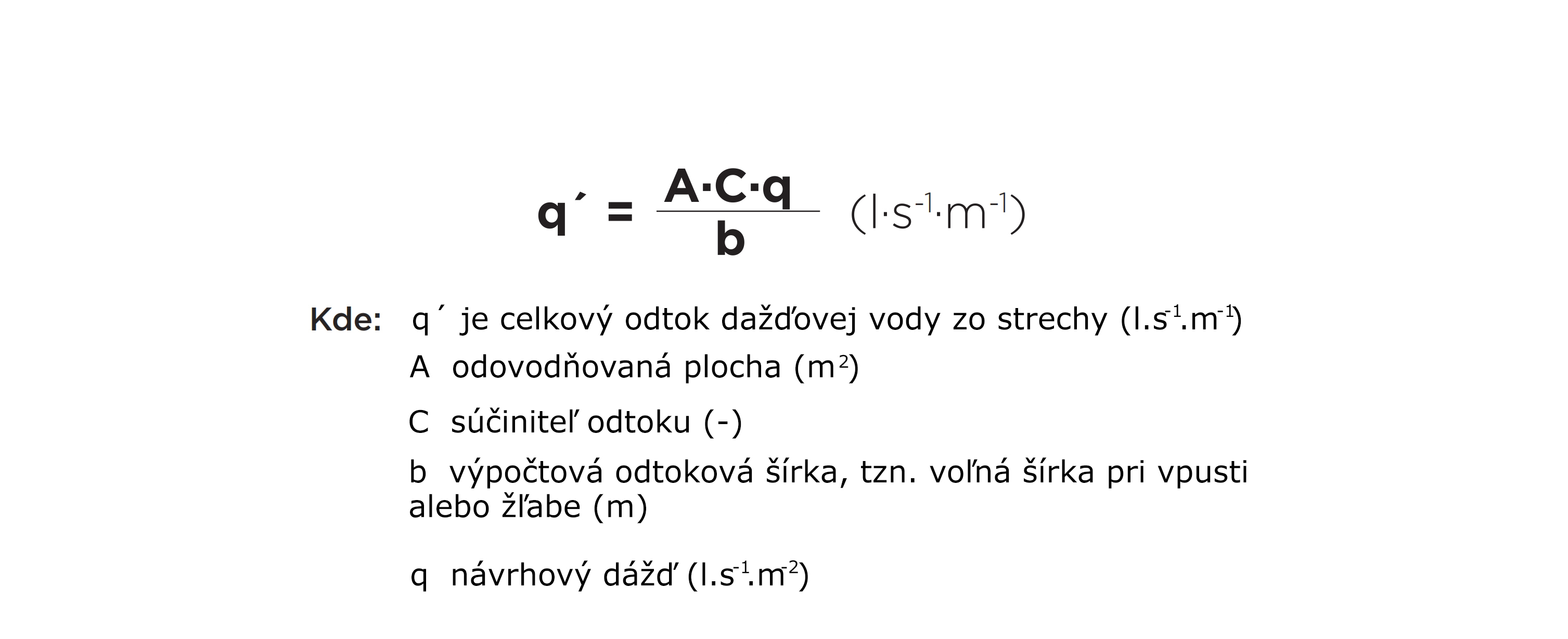 Drenážne kapacity minerálnej vlny pri rôznych sklonoch strechy sú známe (pozri kapitolu 5). Výpočtom je teda nutné overiť, či sú pre danú situáciu dostatočné, alebo bude potrebné doplniť vegetačné súvrstvia o plošný odvodňovací prvok. Nasledujúcim výpočtom sa zistí, aká je potreba odtoku vody na konkrétne streche.