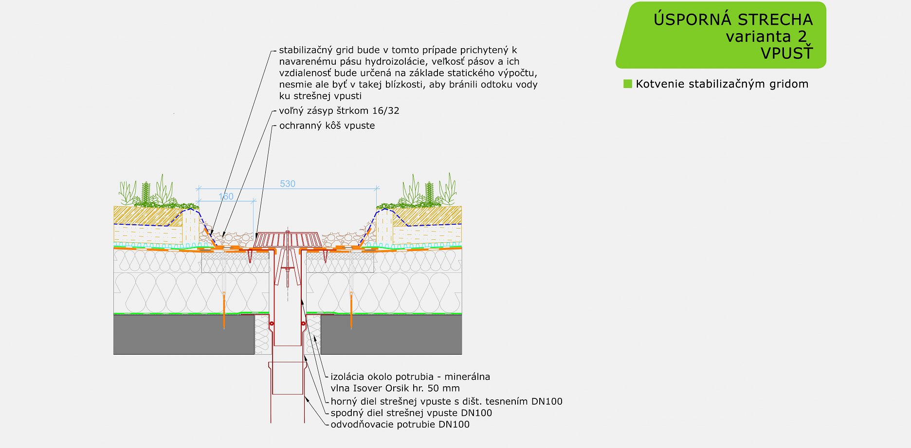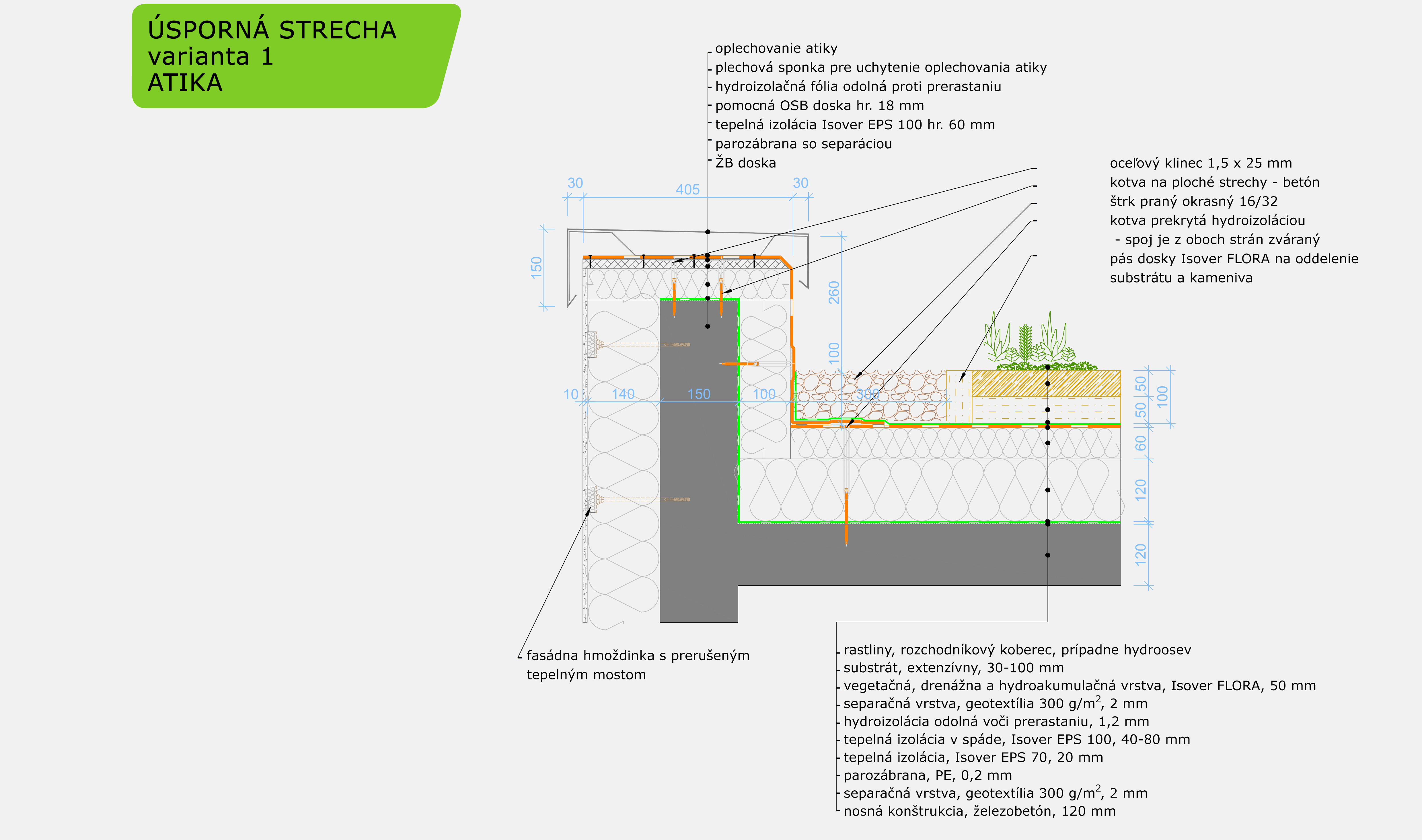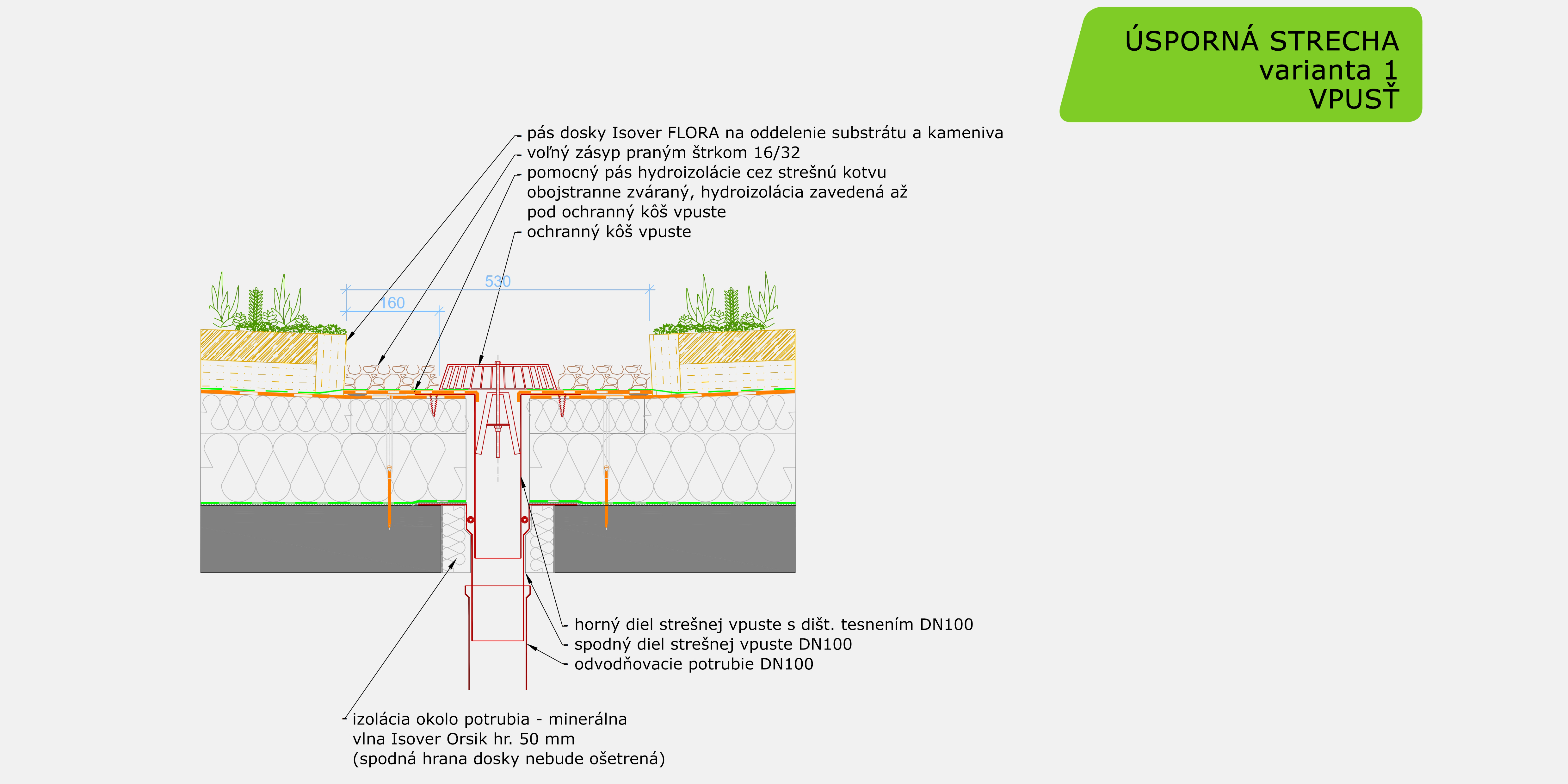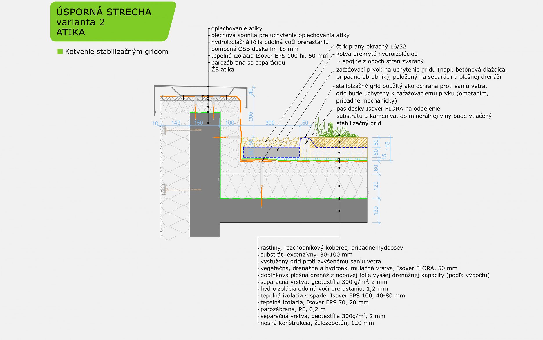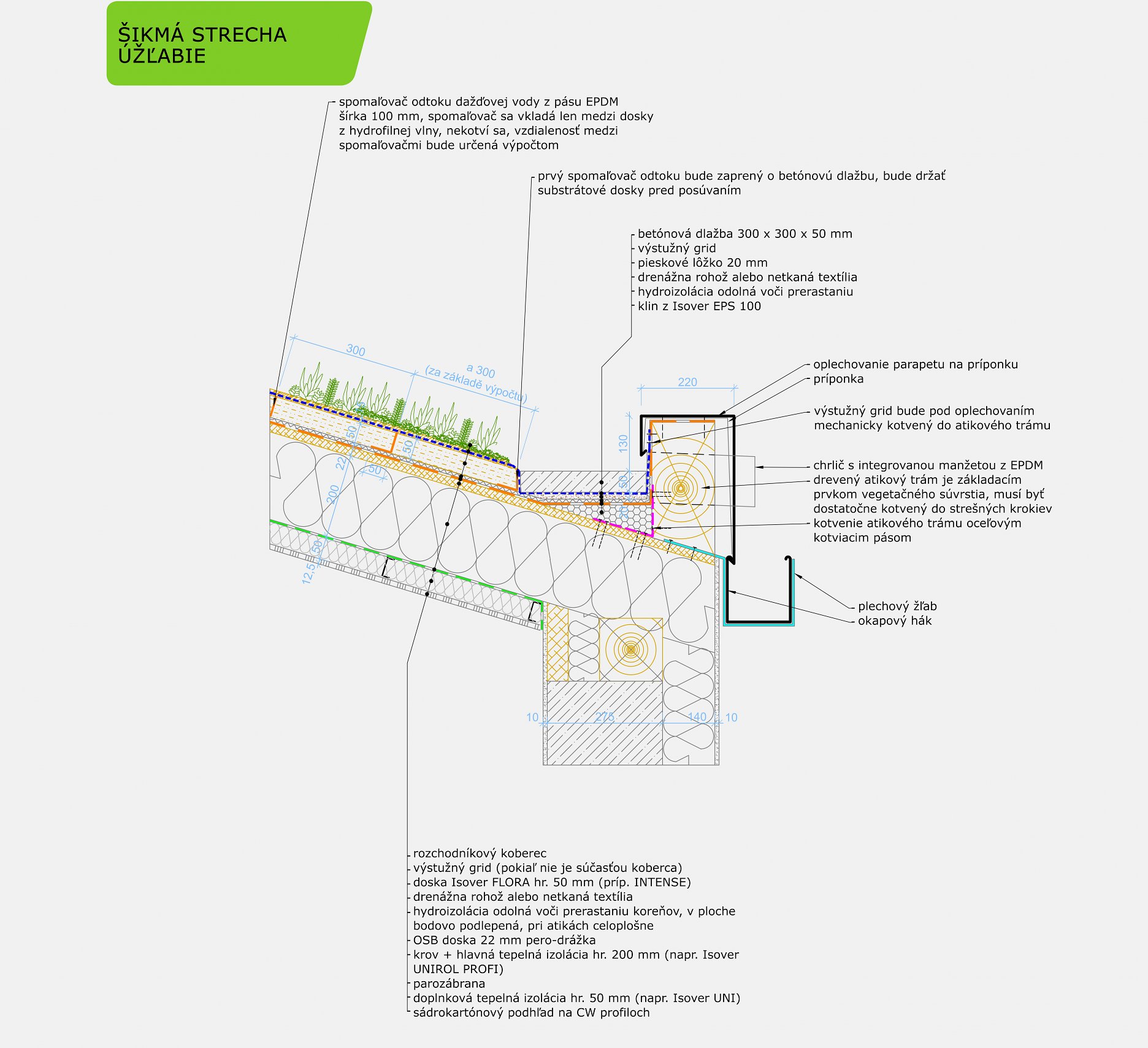 Uvedené stavebné detaily vegetačných striech s použitím hydrofilnej minerálnej vlny Isover slúžia ako ukážka možného spracovanie v projekte. Každá budova je špecifická, preto je nutné výkresy prispôsobiť konkrétnej situácii.