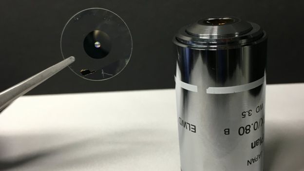 Najnovší príklad použitia metamateriálov predstavili výskumníci z Harvardovej univerzity. Zverejnené video ukazuje namiesto zakriveného kusa skla, známeho z fotoaparátov a ďalekohľadov, vrstvu priehľadného kremeňa, tenšiu než ľudský vlas, pokrytú miliónmi stĺpikov z nanočiastočiek oxidu titaničitého. Tie sú usporiadané do špeciálnych vzorov, ktoré lámu a sústreďujú dopadajúce svetlo.