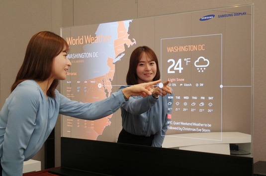 Priehľadný Full HD OLED displej s uhlopriečkou 140 cm má priepustnosť svetla 45 % a rozsah farieb pri NTSC štandardoch je 100 %. Rozlíšenie je Full HD.