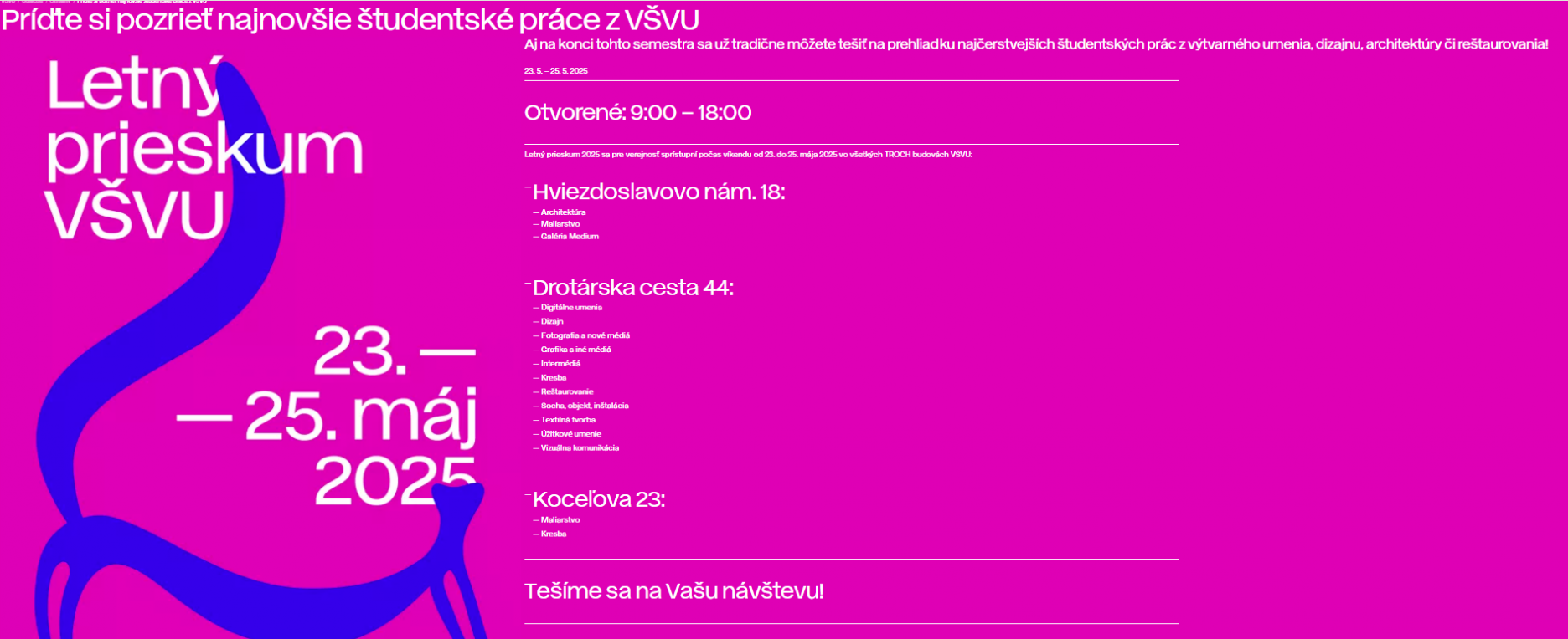 Letný prieskum 2025 sa pre verejnosť sprístupní počas víkendu od 23. do 25. mája 2025 vo všetkých TROCH budovách VŠVU: