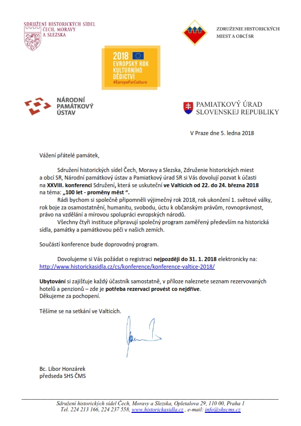 Sdružení historických sídel Čech, Moravy a Slezska, Združenie historických miest a obcí SR, Národní památkový ústav a Pamiatkový úrad SR si Vás dovolují pozvat k účasti na XXVIII. konferenci Sdružení, která se uskuteční ve Valticích od 22. do 24. března 2018 na téma: „100 let - proměny měst “.