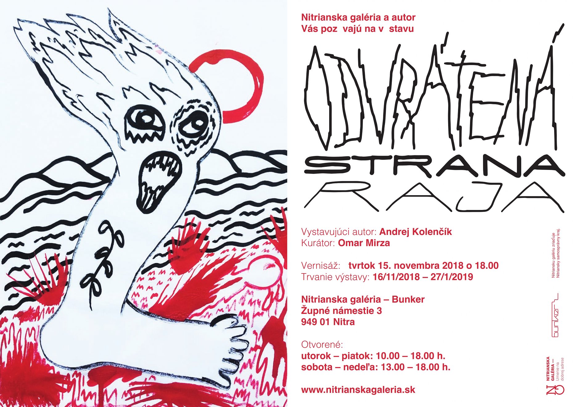 Andrej Kolenčík na prvej samostatnej výstave v Nitre predstavuje svoje videnie sveta a aktuálnej spoločenskej situácie. Jeho uhol pohľadu sa niekomu môže zdať nečakaný, divný, odvrátený, možno až zvrátený. Je to však pohľad autentický a úprimný. Špeciálne pre postapokalyptický priestor Bunkra vytvoril multimediálny environment, rajskú záhradu podzemných rozkoší, postedenské prostredie postfaktickej doby. Postkomiks, postgraffiti, postgrafický postdizajn, postumenie… to všetko a omnoho viac a možno aj niečo úplne iné nájdete v organickej sieti zo spletí útržkov statických i pohyblivých obrázkov, objektov, ruchov a hlukov, na stenách, na projekciách a obrazovkách, v priestore reálnom i ireálnom, v čase vrátenom či odvrátenom.