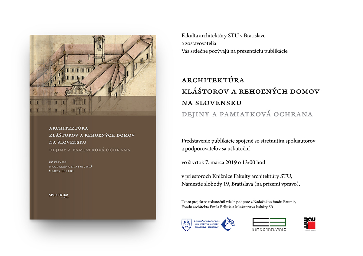 Dovoľujeme si Vás pozvať na prezentáciu publikácie Architektúra kláštorov a rehoľných domov na Slovensku: Dejiny a pamiatková ochrana, dielo vedeckého kolektívu približne tridsiatich autorov. Prezentácia je spojená so stretnutím spoluautorov a podporovateľov tohto projektu.
