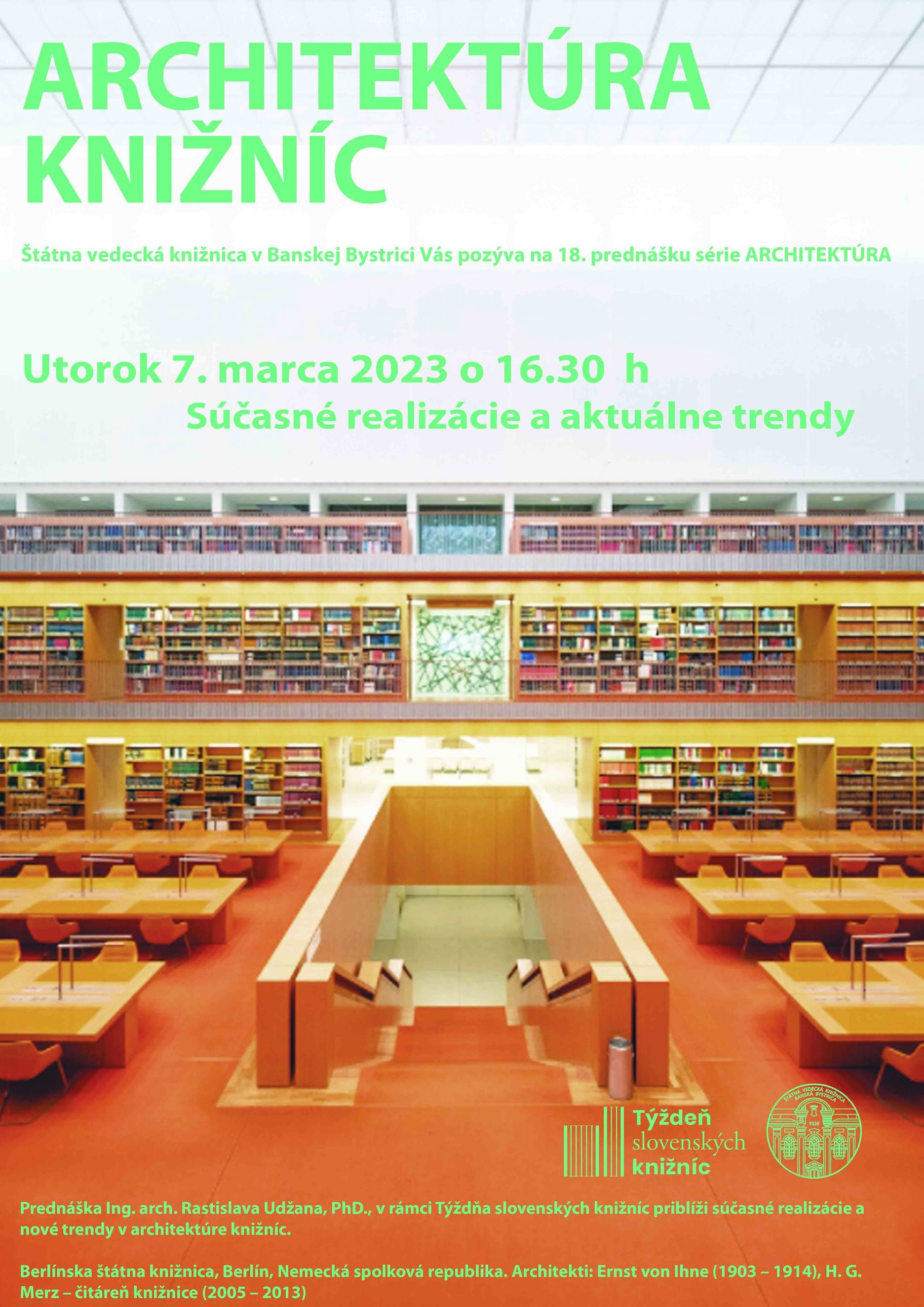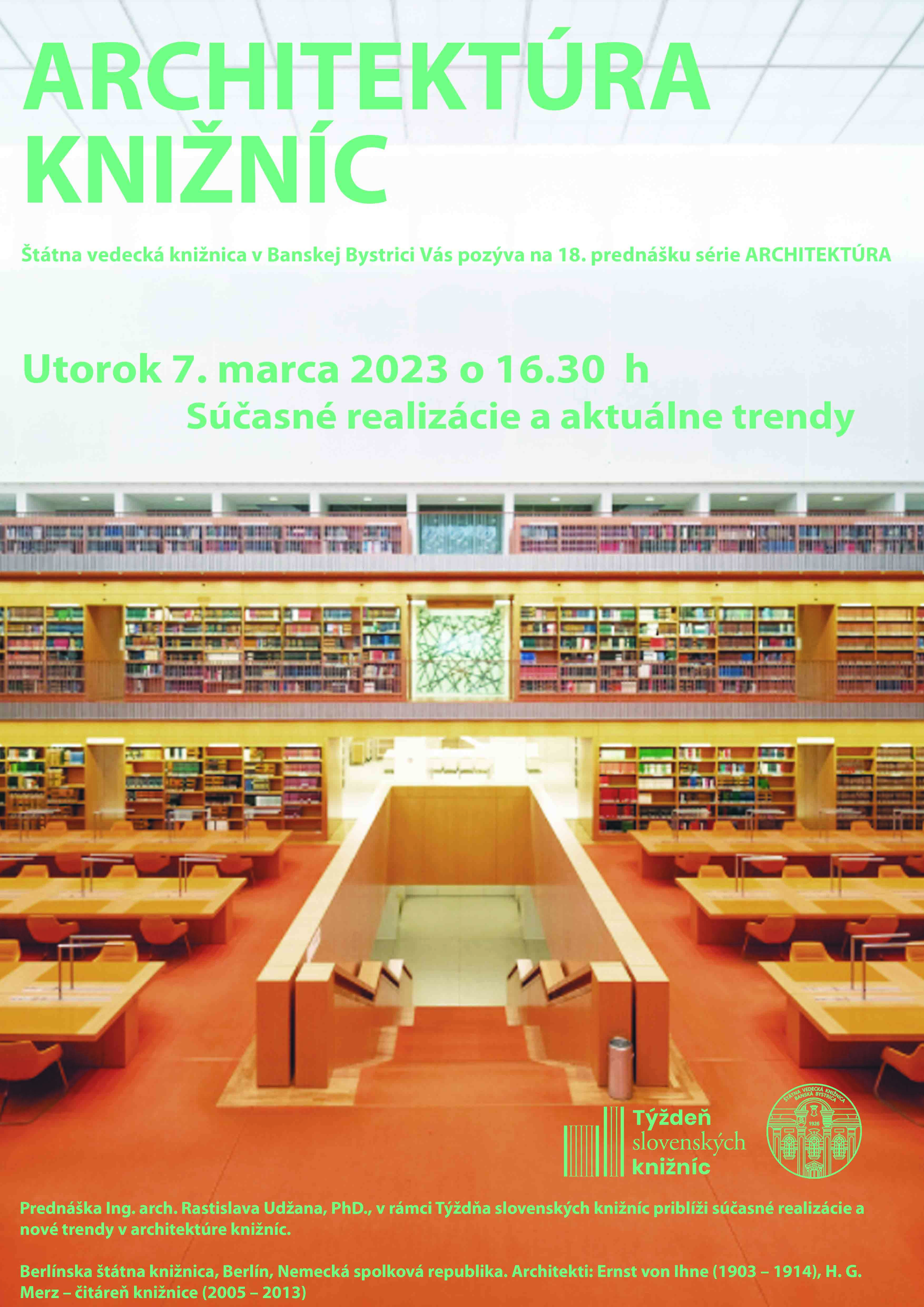 Pozývame Vás na 18. prednášku série Architektúra. Prednáška Ing. arch. Rastislava Udžana, PhD. v rámci Týždňa slovenských knižníc priblíži súčasné realizácie a nové trendy v architektúre knižníc.