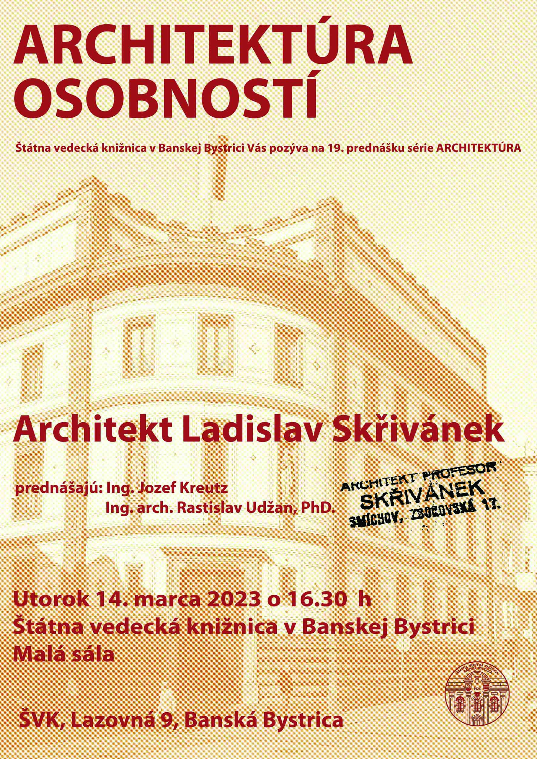 Prijmite pozvanie na 19. prednášku cyklu Architektúra - Architektúra osobností o architektorvi Ladislavovi Skřivánjkovi.