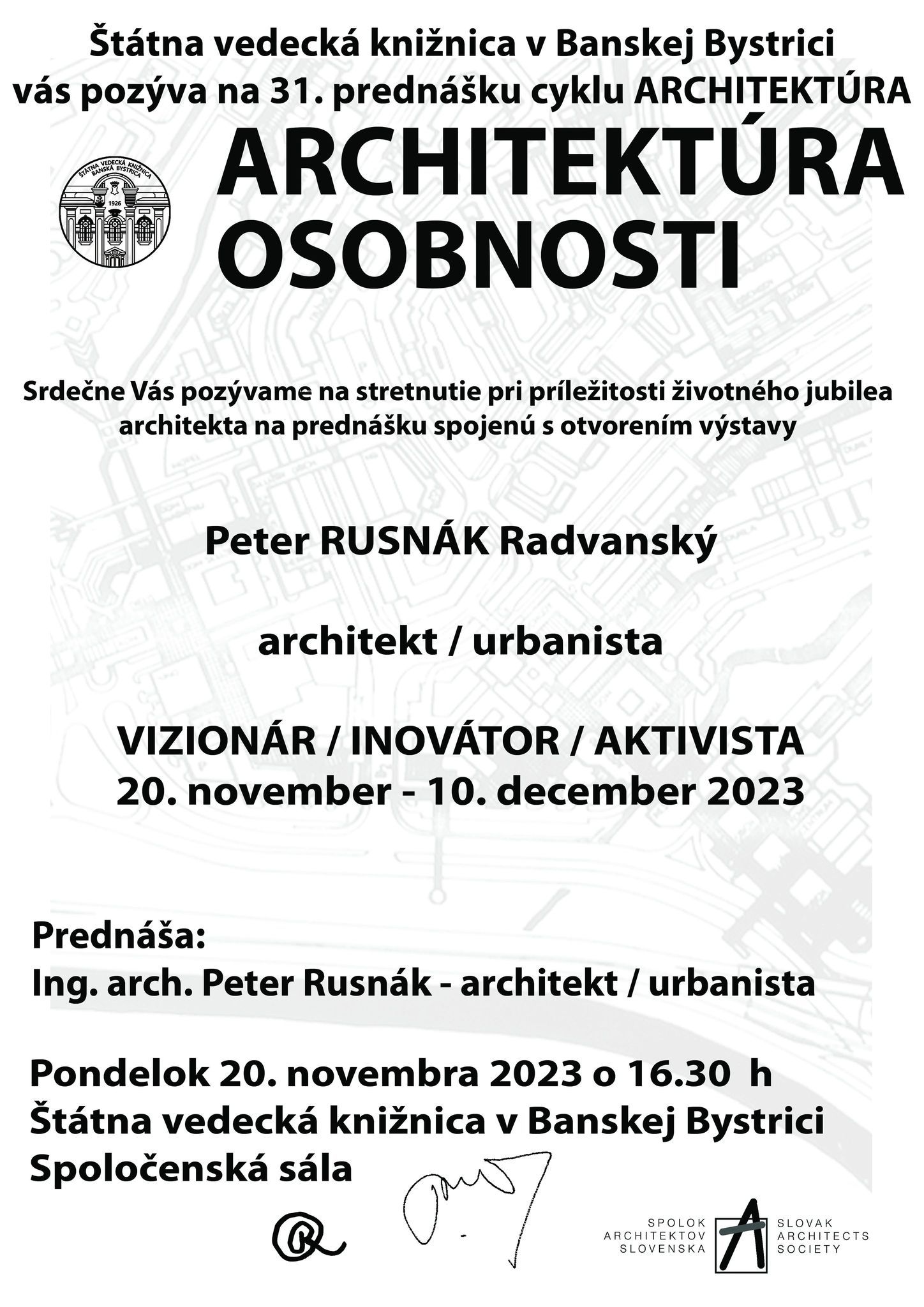 Pri príležitosti životného jubilea architekta, urbanistu a regionalistu Petra Rusnáka prijmite pozvanie na pondelkové otvorenie výstavy a prednášku architekta Petra Rusnáka.