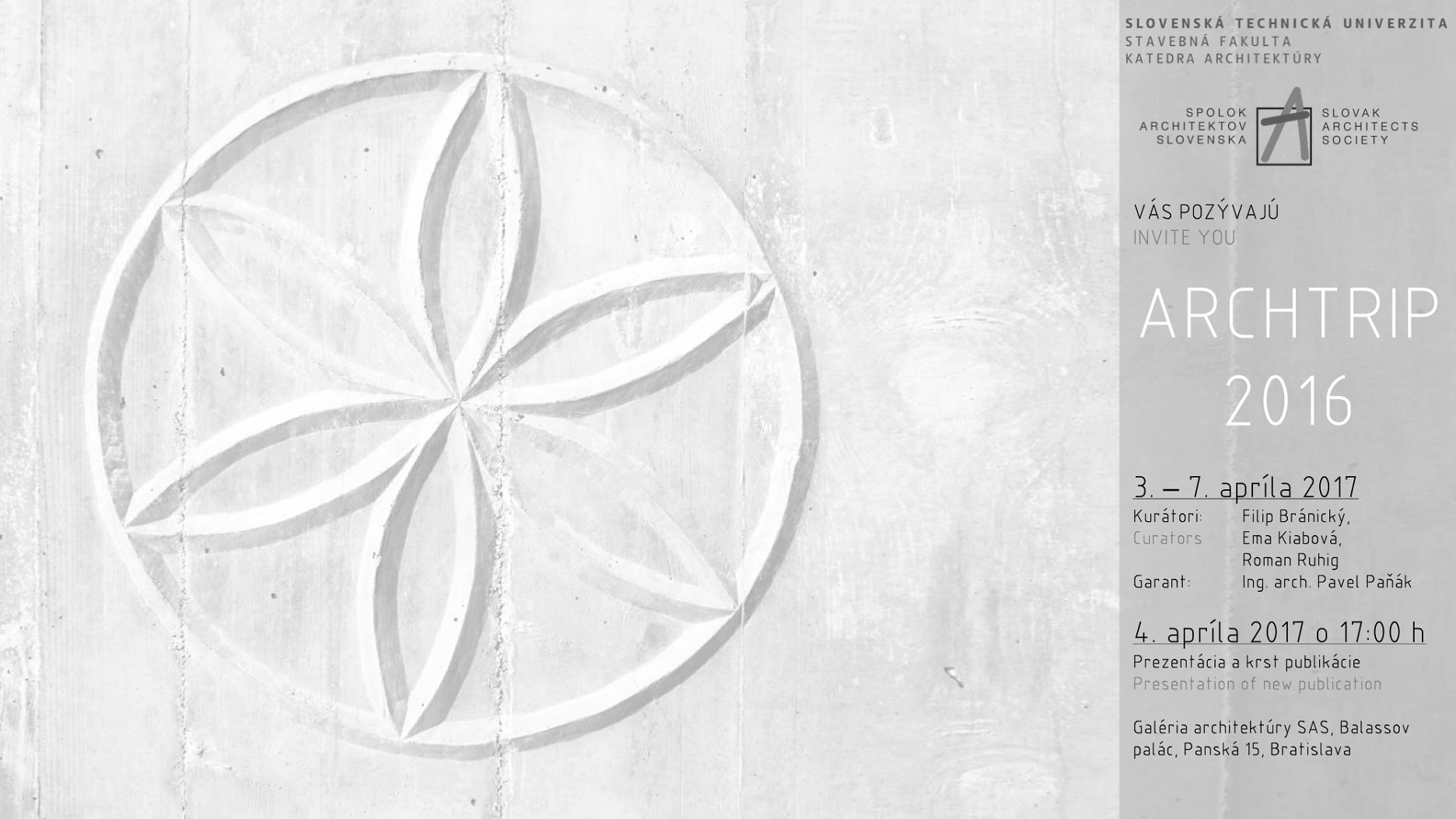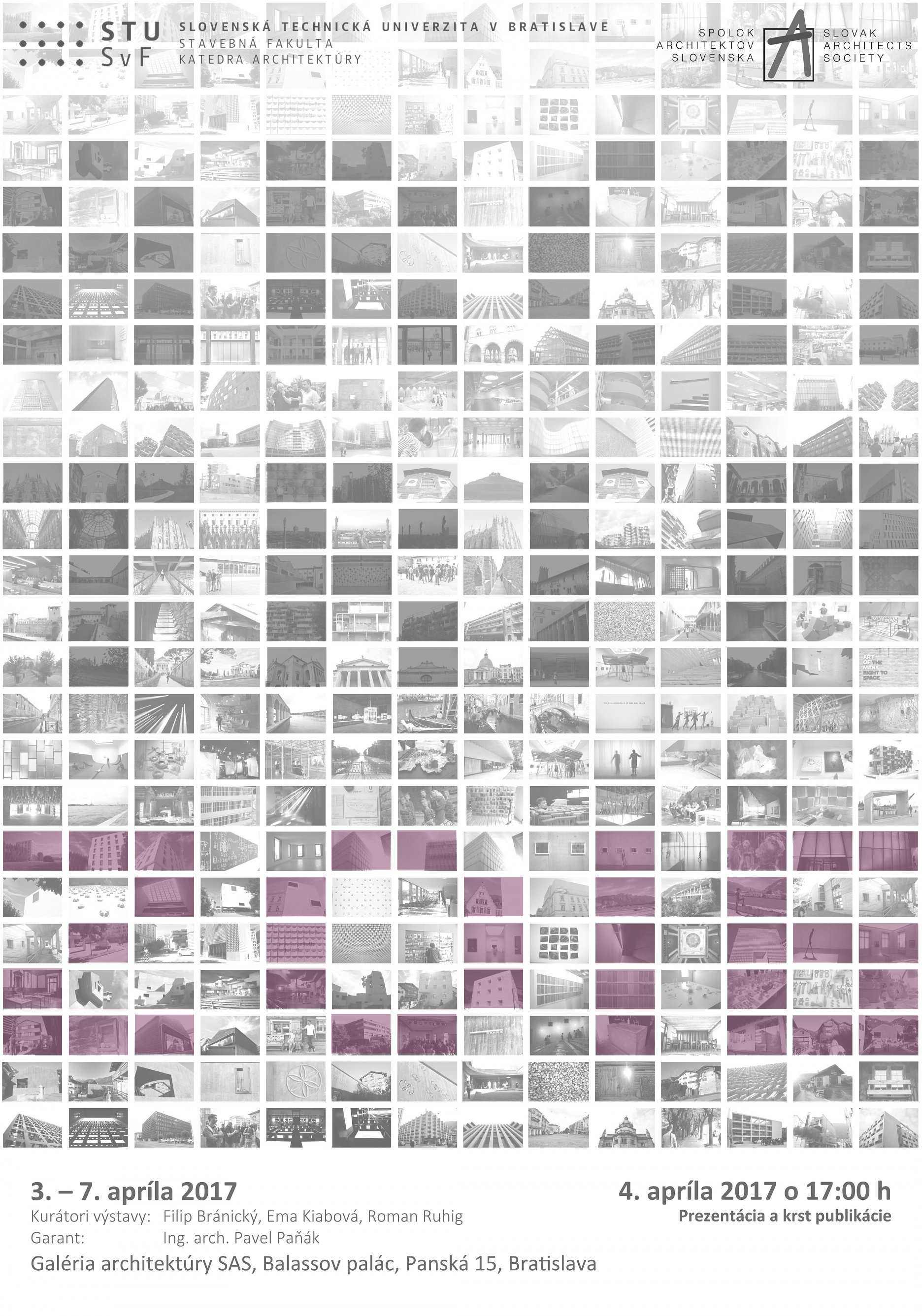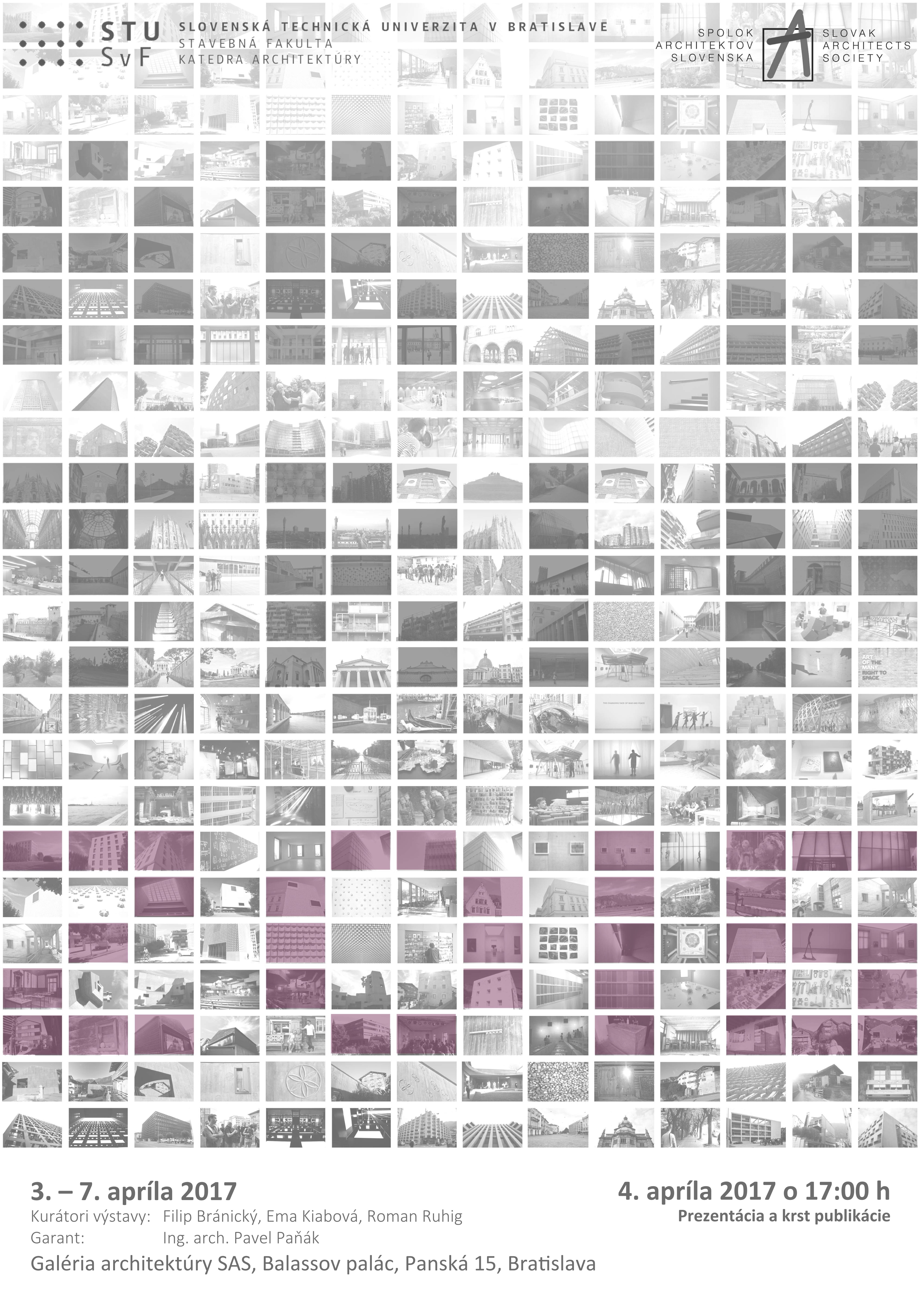 V utorok 4. apríla 2017 sa zastavte na kus reči s kurátormi výstavy a architektom Pavlom Paňákom. vďaka ktorému táto študijná cesta za súčasnou architektúrou vznikla. Vernisáž otvoríme komentovanou vidoeprojekciou a krstom publikácie Archtrip 2016 bedeker o 17.00 h. na Spoloku architektov Slovenska v Galérii architektúry v Balassovom paláci na Panskej 15 v Bratislave. Výstava fotografií potrvá do 7.4. 2017.