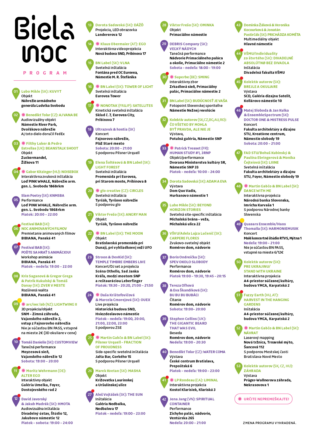 Biela noc je oslavou súčasného umenia. Počas troch jesenných nocí vám priamo v uliciach vášho mesta umožní spoznať tvorbu vo viacerých umeleckých žánroch – od vizuálneho umenia (vrátane svetelného dizajnu a digitálneho umenia) po živé performancie, hudbu, film či literatúru. Svoje obľúbené miesta v programe si nájdu nároční diváci aj rodiny s deťmi.