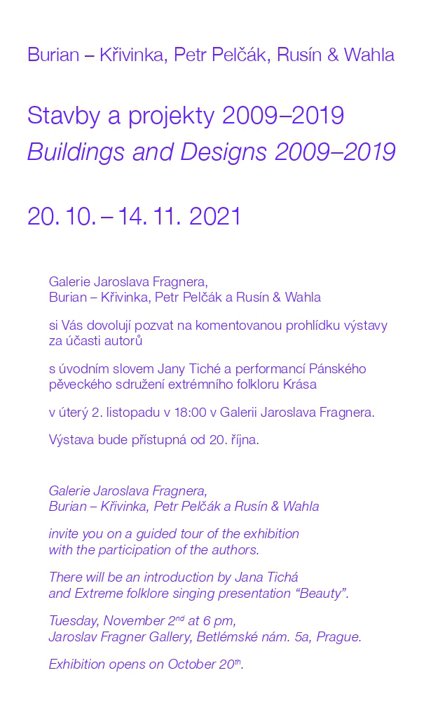 Výstava představí výběr realizovaných staveb i dosud neuskutečněných projektů z posledních deseti let v plánech, fotografiích, modelech i videoprojekci. V souvislosti s výstavou vyšla trojice knižních monografií v češtině a angličtině, zprostředkovávající aktuální tvorbu každého ze tří studií. Jednotlivé monografie uvádí kritické eseje Jany Tiché, následuje výběr staveb s autorskými komentáři. Autorem grafické úpravy bohatě ilustrovaných publikací je David Židlický.