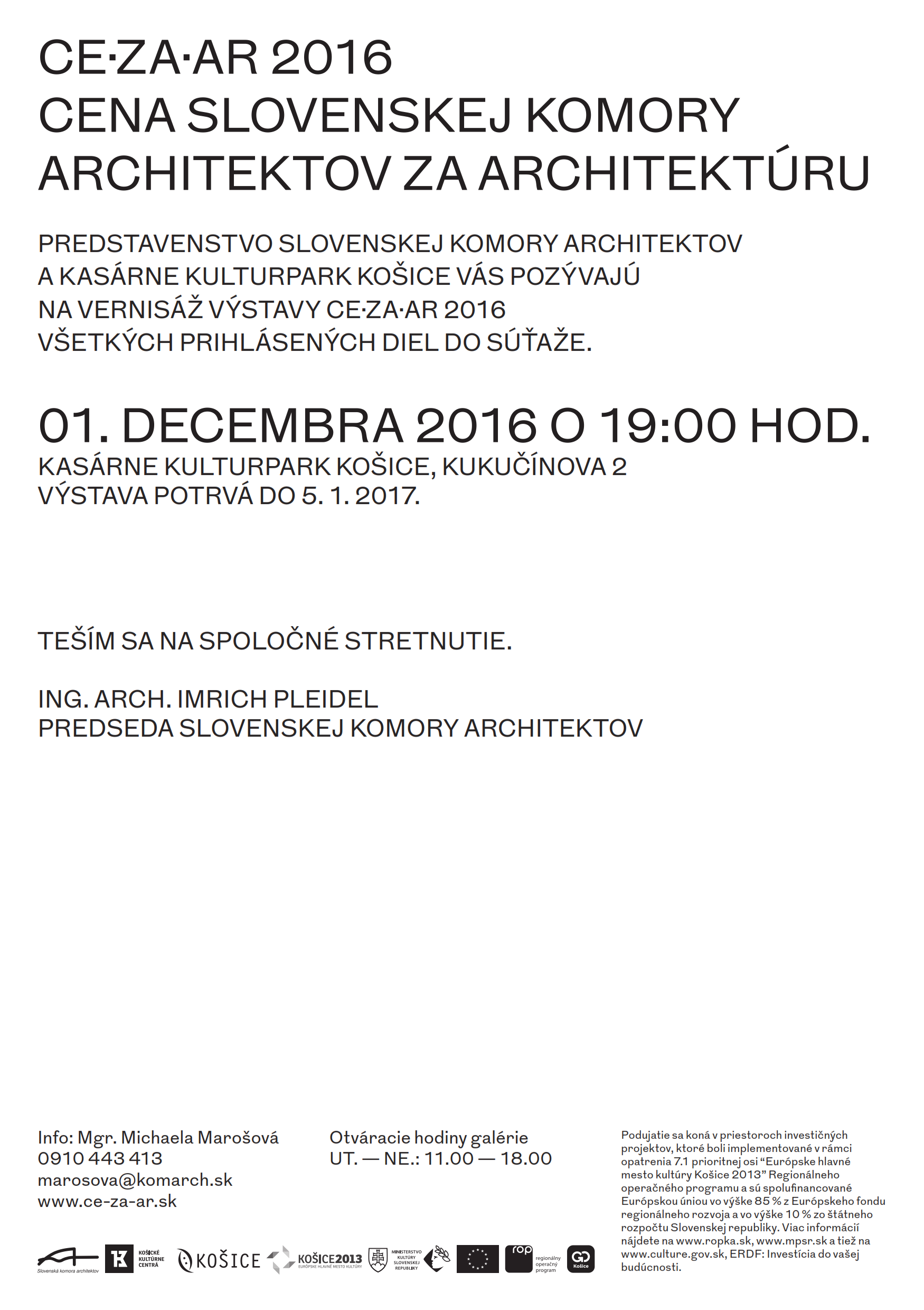 Pozývame Vás na v poradí druhú vernisáž výstavy XV. jubilejného ročníka CE∙ZA∙AR 2016 všetkých prihlásených, nominovaných a ocenených diel Ceny za architektúru, ktorá sa uskutoční 1. decembra 2016 o 19:00 hod. v Kasárňach Kulturpark Košice (Kukučínova 2). Výstava potrvá do 5. januára 2017.