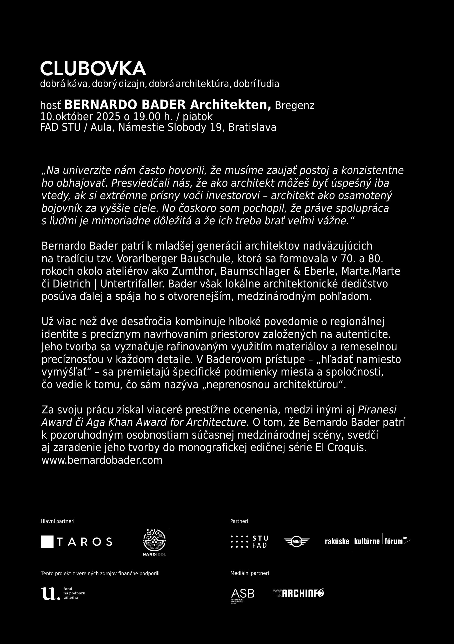 CLUBOVKA je séria podujatí počas roka, ktorá prináša všetkým priaznivcom dobrej architektúry neopakovateľný zážitok a inšpiráciu.