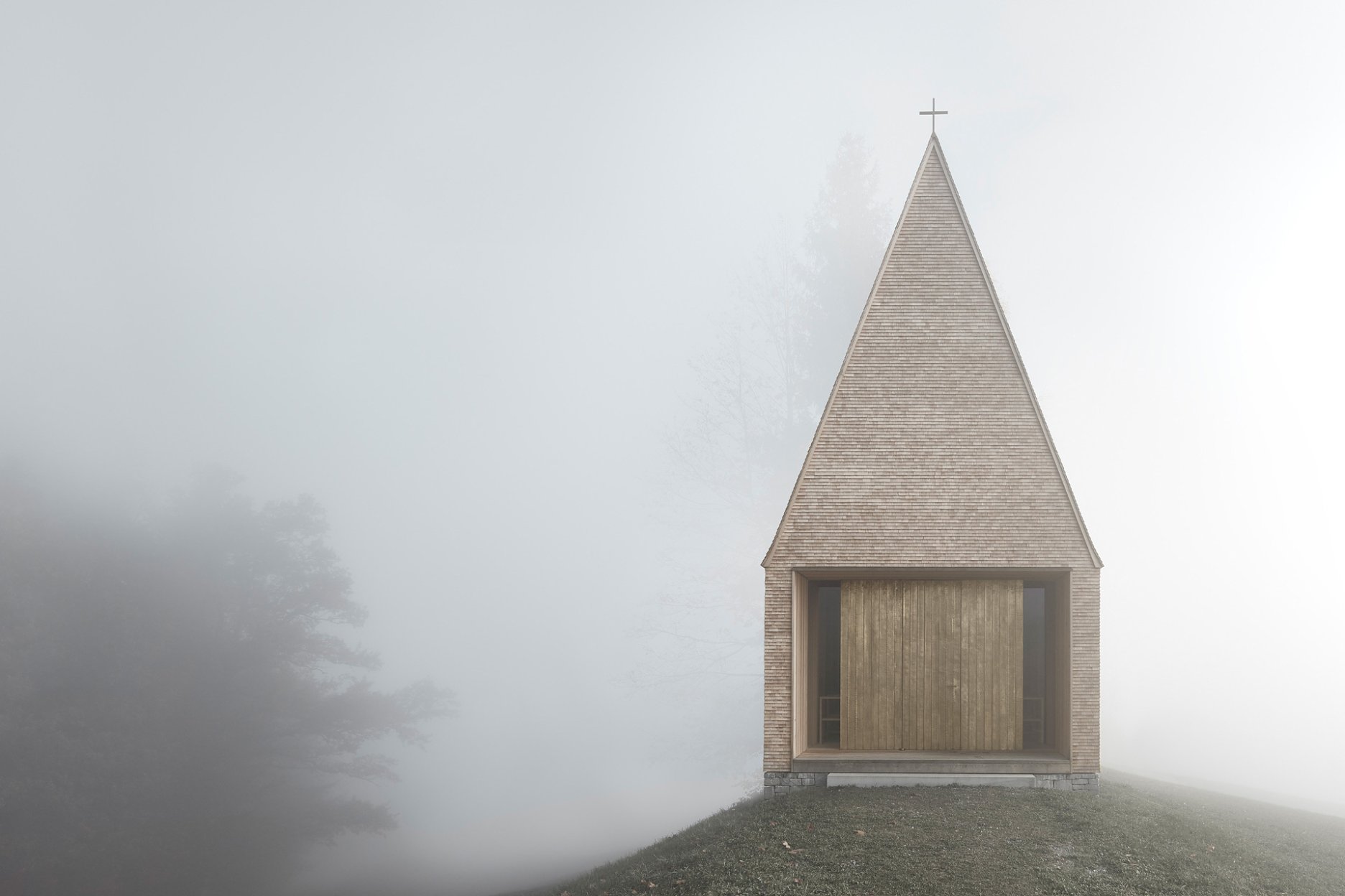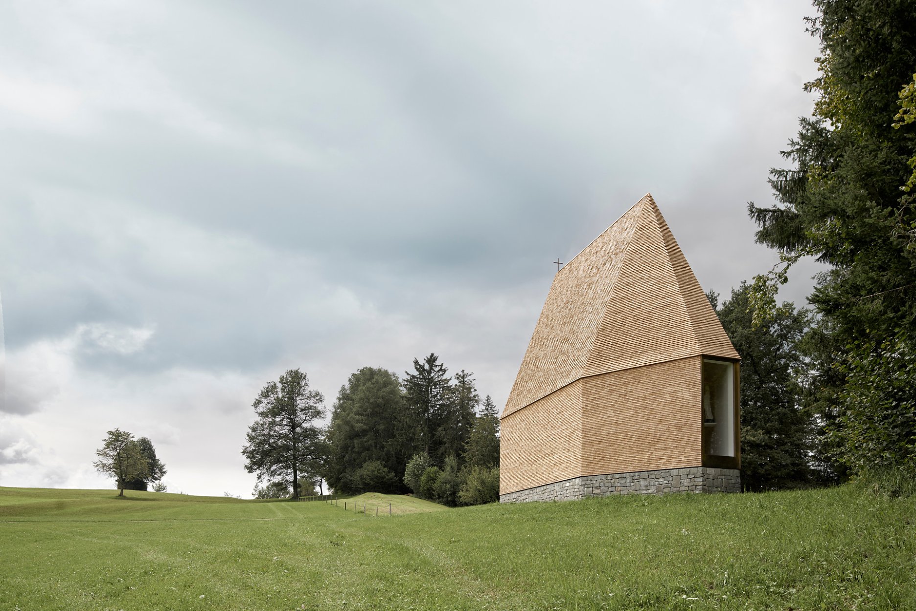The foundation of limestone from Alberschwende was placed as a dry-stone wall, while the walls and ceilings above feature hand-sawn larch shingles to protect against the elements. The recessed entrance creates a protective porch. The wrought brass door leads into the building interior, which is characterized by both an air of solemnness and striking simplicity. Twelve frames, which prevent the folded cross-laminated timber structure from bending out of shape, accentuate the height variations. The wall paneling, floors and simple pews are of untreated fir.