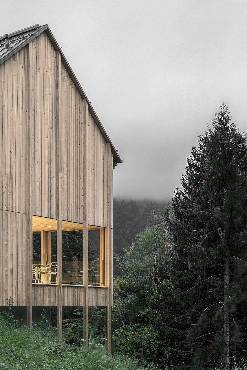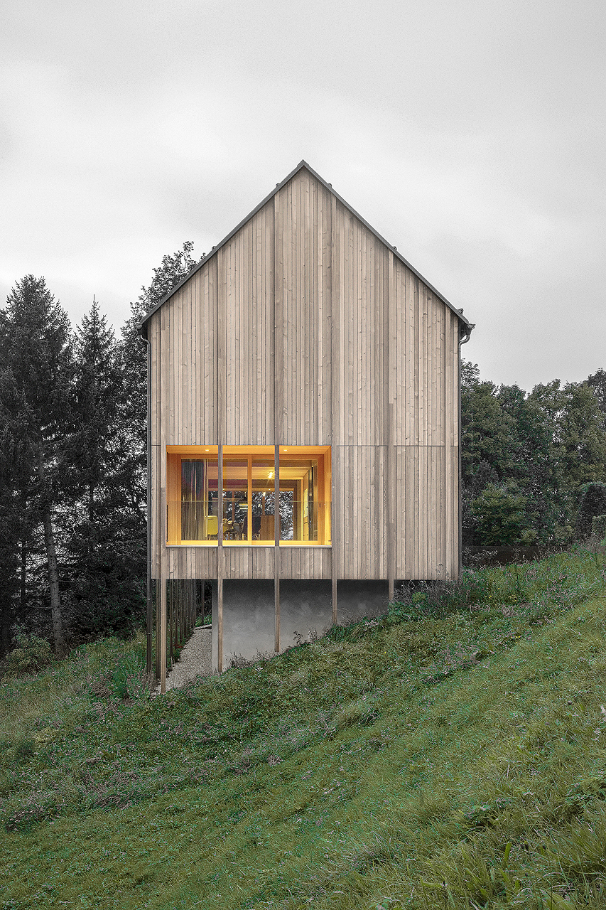This free-standing house is located at a thousand meters above sea level in the “Stürcher Wald” hamlet of the municipality of Laterns in Vorarlberg, on a very steeply sloping southern plot. The plot of land was considered practically unsuitable for construction as it was a residual piece of land along a bend in the road. To benefit from the stunning views and minimize interventions on the site, the building was positioned at the very edge of the property and designed in as compact and elongated a form as possible. The design of the house is based on the traditional building type of long houses that are typical of the “Walserhouse” farming culture. On the other hand, however, the simple long structure with the pitched roof and the austerely structured wooden facade deliberately deviates from its historic example, showing that it is a modern interpretation.