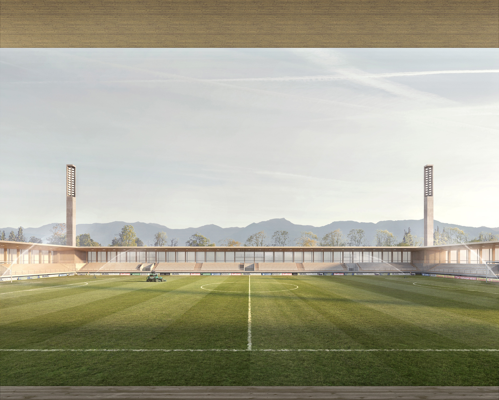 A new stadium for Lustenau. Located in the Rhine Valley on the Austrian/Swiss border directly by the river Rhine - made of wood where feasible - while the south stands are to be retained and integrated. These were the requirements and the contextual conditions for a new stadium. These conditions were also the starting point for the concept and the methods chosen to execute the project. To design a new soccer stadium accommodating ca. 7000 spectators that also creates a strong visual pull requires more than meeting the above conditions.
