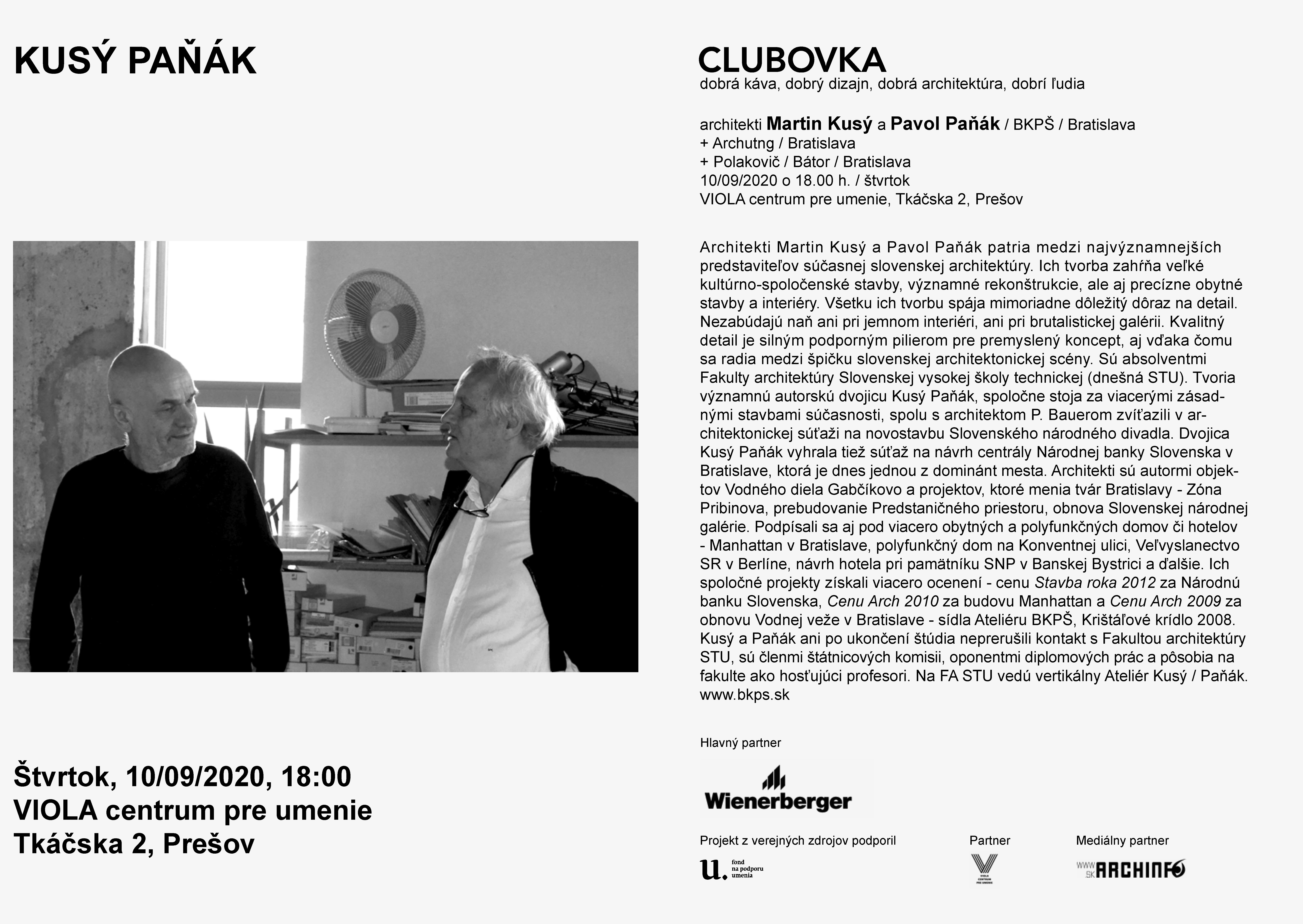 Hosťami CLUBOVKY v Prešove budú architekti Martin Kusý a Pavol Paňák, ktorí patria medzi najvýznamnejších predstaviteľov súčasnej slovenskej architektúry. Ich tvorba zahŕňa veľké kultúrno-spoločenské stavby, významné rekonštrukcie, ale aj precízne obytné stavby a interiéry. Všetku ich tvorbu ale spája mimoriadne dôležitý dôraz na detail. Nezabúdajú naň ani pri jemnom interiéri, ani pri brutalistickej galérii. Kvalitný detail je silným podporným pilierom pre premyslený koncept, aj vďaka čomu sa radia medzi špičku slovenskej architektonickej scény. Sú absolventmi Fakulty architektúry Slovenskej vysokej školy technickej (dnešná STU). Tvoria významnú autorskú dvojicu Kusý Paňák, spoločne stoja za viacerými zásadnými stavbami súčasnosti, spolu s architektom P. Bauerom zvíťazili v architektonickej súťaži na novostavbu Slovenského národného divadla. Dvojica Kusý Paňák vyhrala tiež súťaž na návrh centrály Národnej banky Slovenska v Bratislave, ktorá je dnes jednou z dominánt mesta. Architekti sú autormi objektov Vodného diela Gabčíkovo a projektov, ktoré menia tvár Bratislavy - Zóna Pribinova, prebudovanie Predstaničného priestoru, obnova Slovenskej národnej galérie ... Podpísali sa aj pod aj viacero obytných a polyfunkčných domov či hotelov - Manhattan v Bratislave, polyfunkčný dom na Konventnej ulici, Veľvyslanectvo SR v Berlíne, návrh hotela pri pamätníku SNP v Banskej Bystrici a ďalšie.