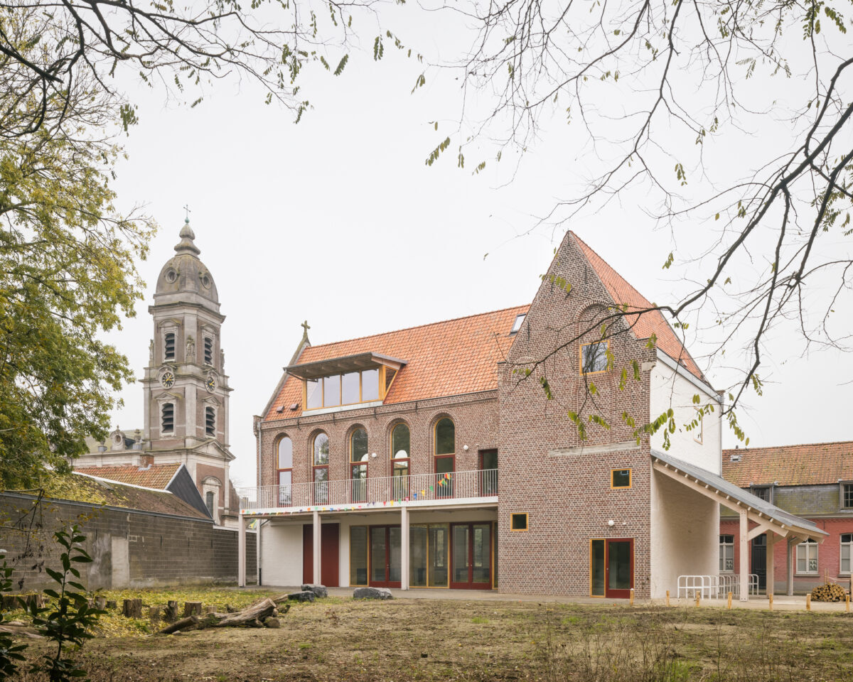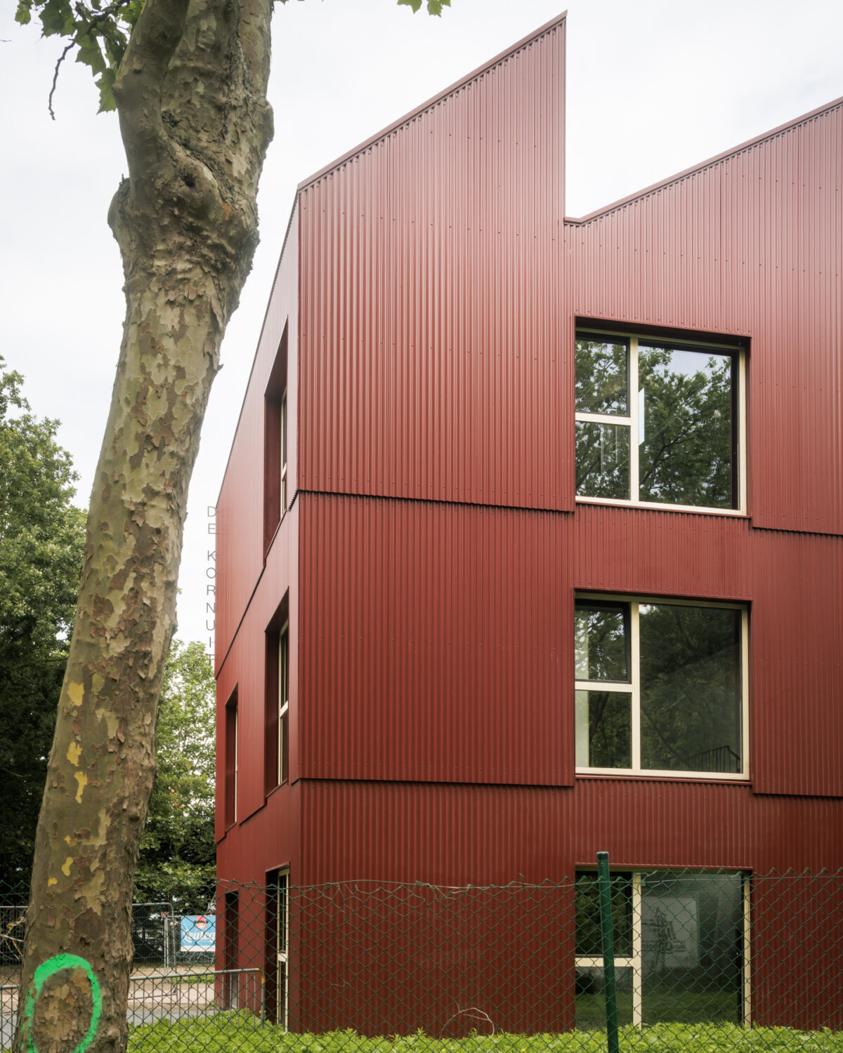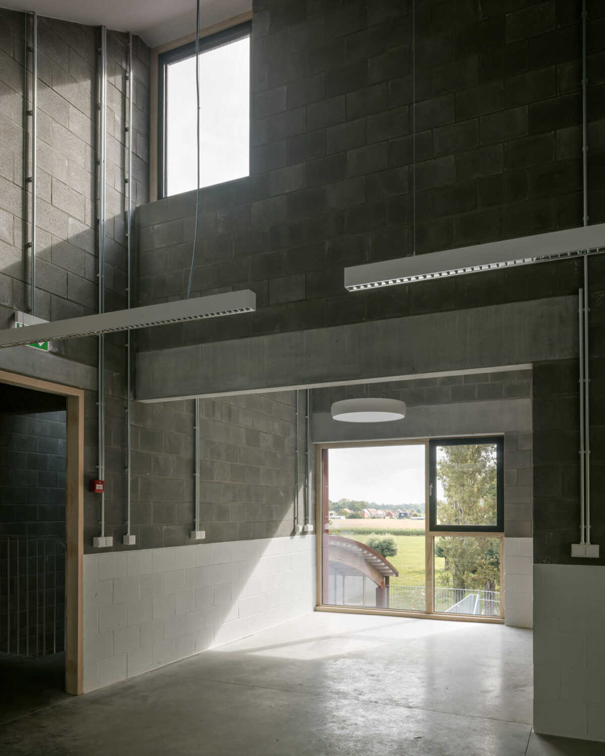 The existing warehouse will be renovated and completed with a new, compact volume. Due to the compact footprint of the new volume, the green space is maximally preserved. The position of this new addition structures the outdoor space, creating two different outdoor areas, according to the needs of the children.
