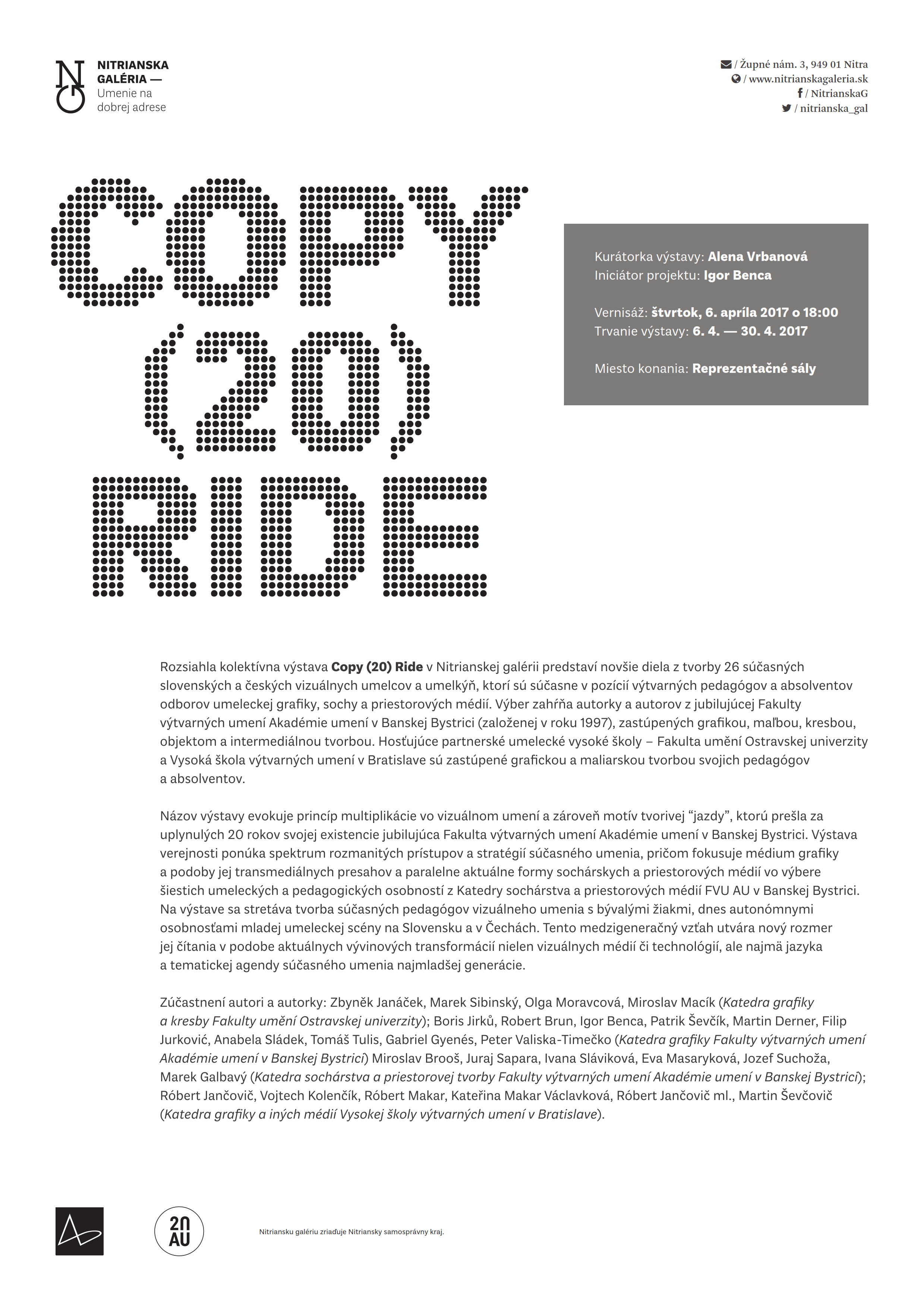 Rozsiahla kolektívna výstava Copy (20) Ride v Nitrianskej galérii predstaví novšie diela z tvorby 26 súčasných slovenských a českých vizuálnych umelcov a umelkýň, ktorí sú súčasne v pozícií výtvarných pedagógov a absolventov odborov umeleckej grafiky, sochy a priestorových médií. Výber zahŕňa autorky a autorov z jubilujúcej Fakulty výtvarných umení Akadémie umení v Banskej Bystrici (založenej v roku 1997), zastúpených grafikou, maľbou, kresbou, objektom a intermediálnou tvorbou. Hosťujúce partnerské umelecké vysoké školy – Fakulta umění Ostravskej univerzity a Vysoká škola výtvarných umení v Bratislave sú zastúpené grafickou a maliarskou tvorbou svojich pedagógov a absolventov.