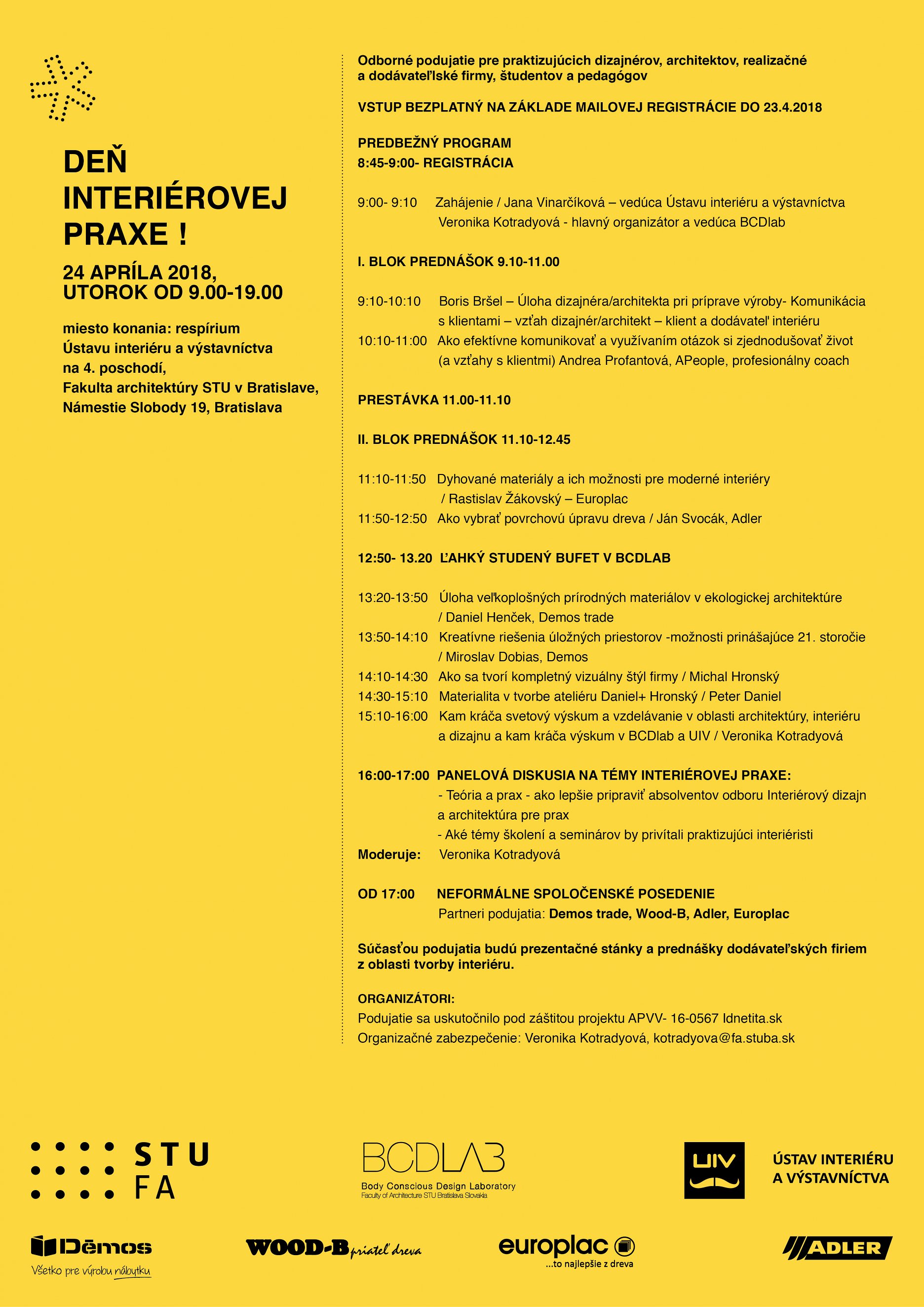 Odborné podujatie pre praktizujúcich dizajnérov, architektov, realizačné a dodávateľské firmy, študentov a pedagógov na Ústave interiéru a výstavníctva FA STU.