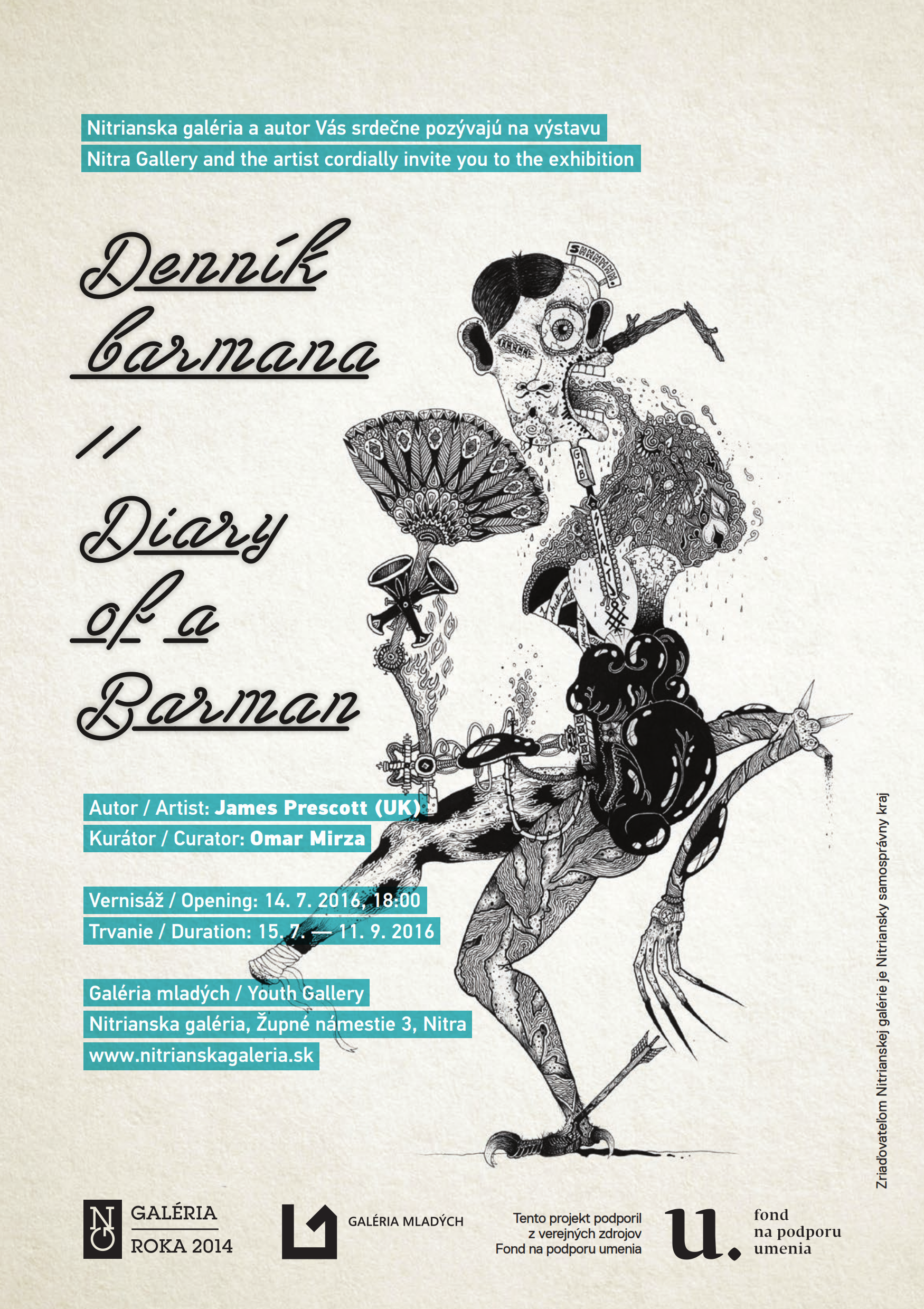 Mladý anglický výtvarník James Prescott sa v Galérii mladých Nitrianskej galérie predstavil už v roku 2012 na medzinárodnej skupinovej výstave Stairway to… / Schody do… Vtedy vytvoril priestorové diela priamo na mieste. Tentokrát na svoju prvú samostatnú výstavu v Nitre prinesie najnovšie kresby, maľby a koláže, v ktorých sa prejavujú rôzne polohy jeho tvorby.