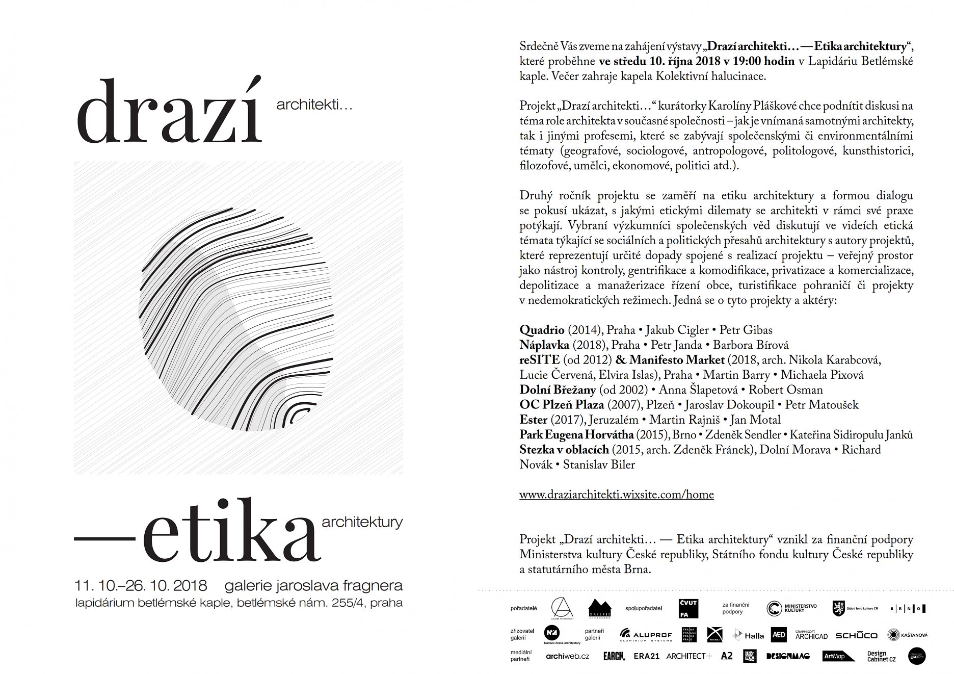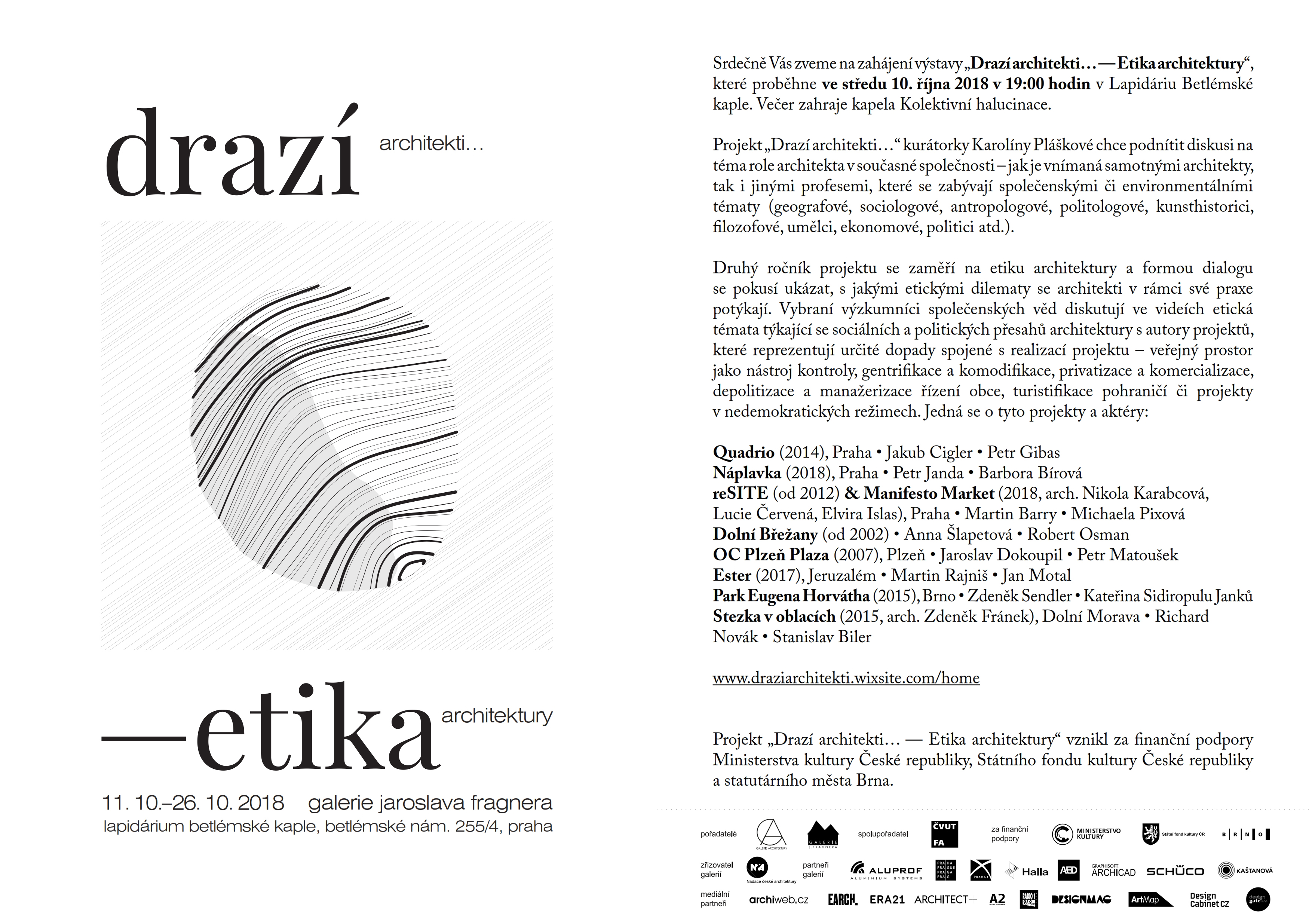 Srdečně Vás zveme na zahájení výstavy „Drazí architekti…— Etika architektury“, které proběhne ve středu 10. října 2018 v 19:00 hodin v prostorách Lapidária Betlémské kaple, Betlémské nám. 255/4 v Praze. Výstava bude otevřena úterý–neděle od 11:00 do 19:00 hodin a potrvá do 26. října 2018.